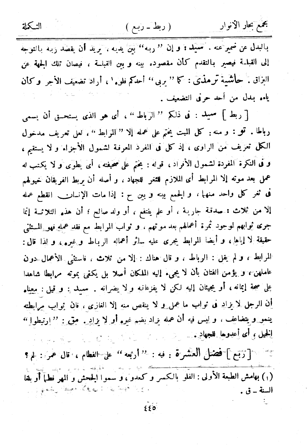 [ربط] سيد: في ذلكم "الرباط"، أي هو الذي يستحق أن يسمى رباطًا. تو: ومنه: كل الميت يختم على عمله إلا "المرابط"، لعل تعريف مدخول الكل تعريف من الراوي، إذ كل في المفرد المعرفة لشمول الأجزاء ولا يستقيم، وفي النكرة المفردة لشمول الأفراد، قوله: يختم على صحيفته، أي يطوى ولا يكتب له عمل بعد موته إلا المرابط أي الملازم للثغر للجهاد، وأصله أن يربط الفريقان خيولهم في ثغر كل واحد منهما، والجمع بينه وبين ح: إذا مات الإنسان انقطع عمله إلا من ثلاث: صدقة جارية، أو علم ينتفع به، أو ولد صالح، أن هذه الثلاثة إنما جرى ثوابهم لوجود ثمرة أعمالهم بعد موتهم، وثواب المرابط مع فقد عمله فهو المستثني حقيقة لا إياها، وأيضًا المرابط يجري عليه سائر أعماله الرباط وغيره، ولذا قال: المرابط، ولم يقل: الرباط، وقال هناك: إلا من ثلاث، فاستثنى الأعمال دون عاملهن، ويؤمن الفتان بأن لا يجيء إليه الملكان أصلًا بل يكفي بموته مرابطًا شاهدًا على صحة إيمانه، أو يجيئان إليه لكن لا يفزعانه ولا يضرانه. سيد: وقيل: معناه أن الرجل لا يزاد في ثواب ما عمل ولا ينقص منه إلا الغازي، فإن ثواب مرابطته ينمو ويتضاعف، وليس فيه أن عمله يزاد بضم غيره أو لايزاد. مق: "ارتبطوا" الخيل، أي أعدوها للجهاد.