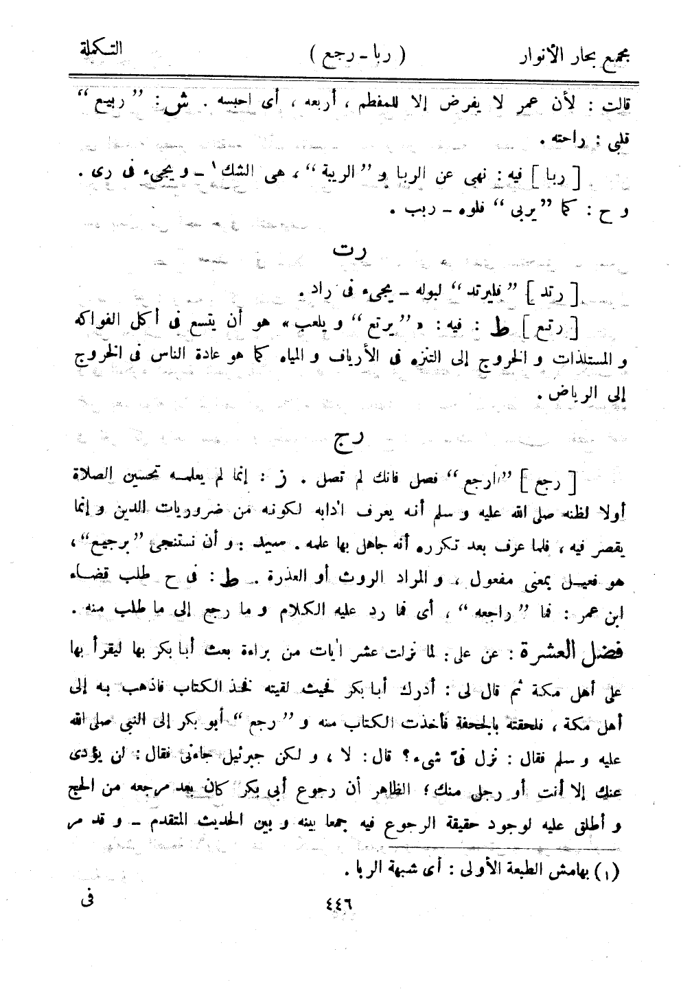[رجع] "ارجع" فصل فإنك لم تصل. ز: إنما لم يعلمه تحسين الصلاة أولًا لظنه صلى الله عليه وسلم أنه يعرف أدابه لكونه من ضروريات الدين وإنما يقصر فيه، فلما عرف بعد تكرره أنه جاهل بها علمه. سيد: وأن نستنجي "برجيع"، هو فعيل بمعنى مفعول، والمراد الروث أو العذرة. ط: في ح طلب قضاء ابن عمر: فما "راجعه"، أي فما رد عليه الكلام وما رجع إلى ما طلب منه. فضل العشرة: عن علي: لما نزلت عشر آيات من براءة بعث أبا بكر بها ليقرأ بها على أهل مكة ثم قال لي: أدرك أبا بكر فحيث لقيته فخذ الكتاب فاذهب به إلى أهل مكة، فلحقته بالجحفة فأخذت الكتاب منه و"رجع" أبو بكر إلى النبي صلى الله عليه وسلم فقال: نزل فيّ شيء؟ قال: لا، ولكن جبرئيل جاءني فقال: لن يؤدي عنك غلا أنت أو رجل منك، الظاهر أن رجوع أبي بكر كان بعد مرجعه من الحج وأطلق عليه لوجود حقيقة الرجوع فيه جمعًا بينه وبين الحديث المتقدم - وقد مر