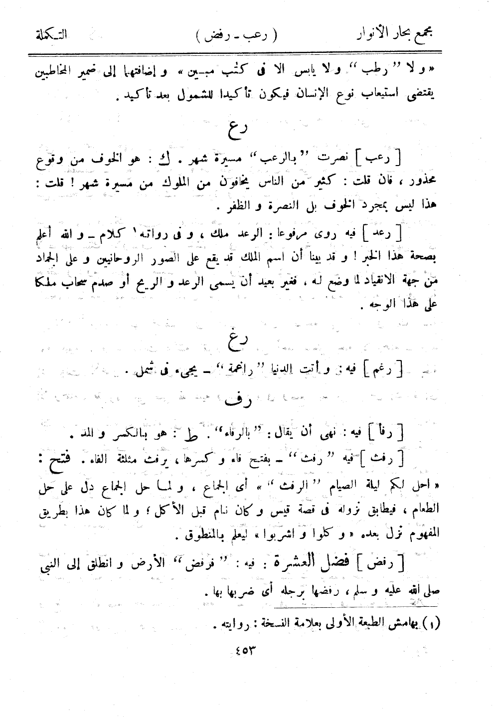 [رعب] نصرت "بالرعب" مسيرة شهر. ك: هو الخوف من وقوع محذور، فإن قلت: كثير من الناس يخافون من الملوك من مسيرة شهر! قلت: هذا ليس بمجرد الخوف بل النصرة والظفر.