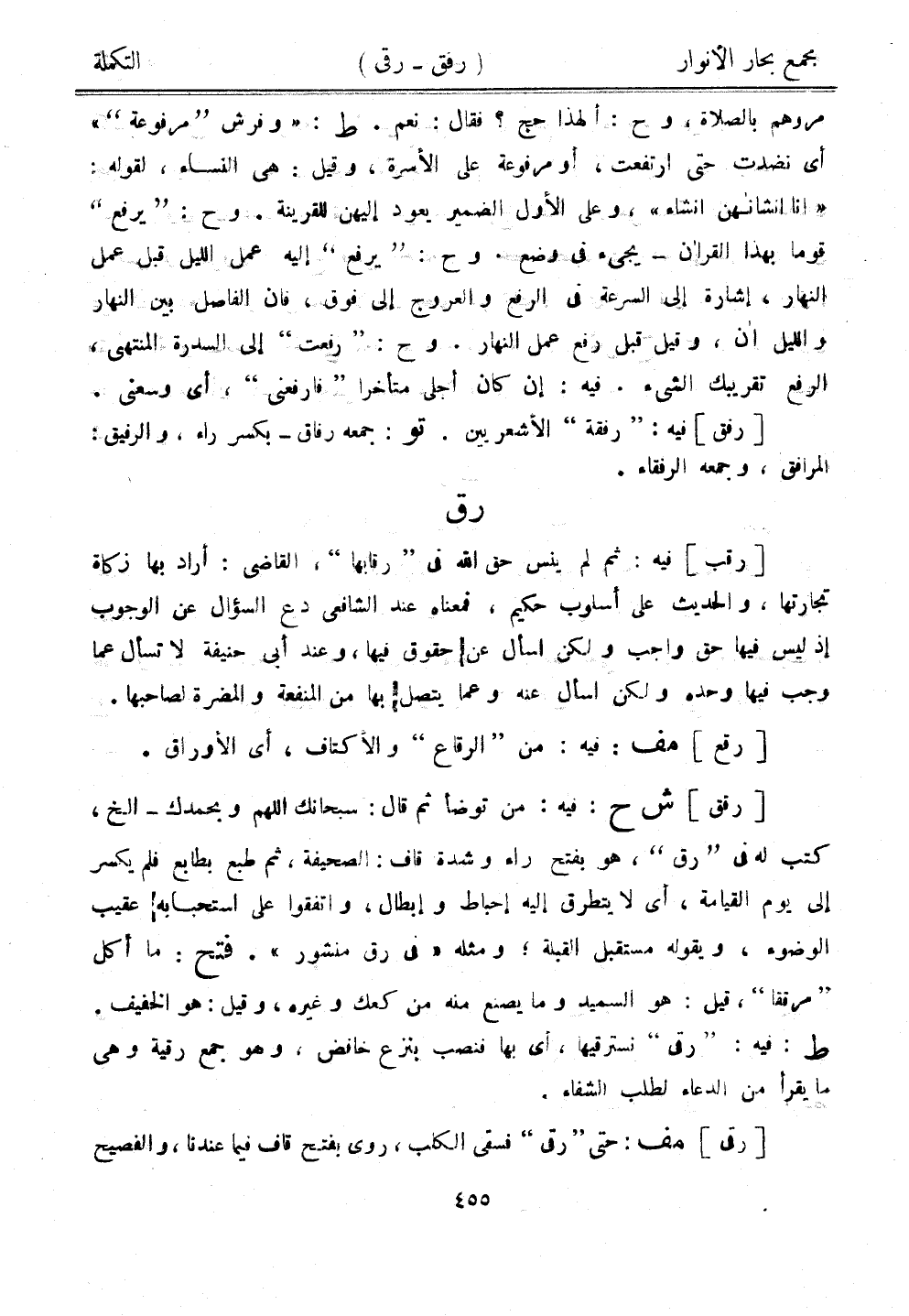 [رقق] ش ح: فيه: من توضأ ثم قال سبحانك اللهم وبحمدك - إلخ، كتب له في "رق"، هو بفتح راء وشدة قاف: الصحيفة، ثم طبع بطابع فلم يكسر إلى يوم القيامة، أي لا يتطرق إليه إحباط وإبطال، واتفقوا على استحبابه عقيب الوضوء، ويقوله مستقبل القبلة؛ ومثله "في رق منشور". فتح: ما أكل "مرققا"، قيل: هو السميد وما يصنع منه من كعك وغيره، وقيل: هو الخفيف. ط: فيه: "رقى" نسترقيها، أي بها فنصب بنزع خافض، وهو جمع رقية وهي ما يقرأ من الدعاء لطلب الشفاء.