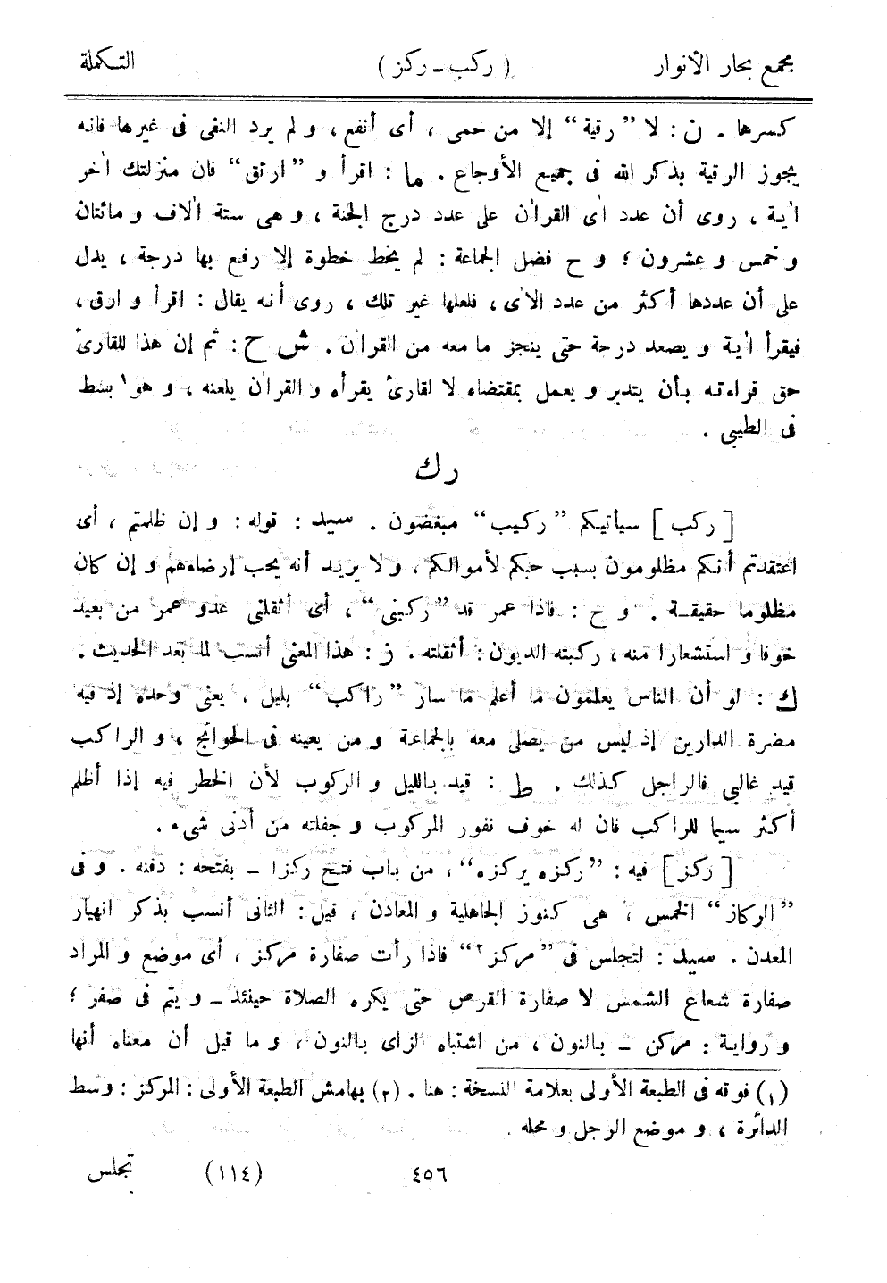 [ركز] فيه: "ركزه يركزه"، من باب فتح ركزًا - بفتحه: دفنه. وفي "الركاز" الخمس، هي كنوز الجاهلية والمعادن، يل: الثاني أنسب بذكر انهيار "الركاز" الخمس، هي كنوز الجاهلية والمعادن، قيل: الثاني أنسب بذكر انهيار المعدن. سيد: لتجلس في "مركز" فإذا رأت صفارة مركز، أي موضع والمراد صفارة شعاع الشمس لا صفارة القرص حتى يكره الصلاة حينئذ -ويتم في صفر، ورواية مركن - بالنون، من اشتباه الزاي بالنون، وما قيل أن معناه أنها