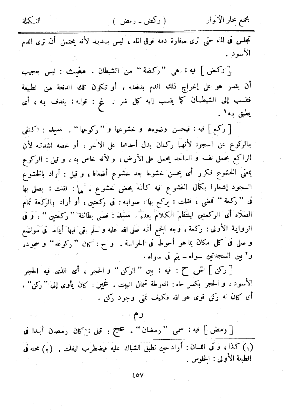 [ركع] فيه: فيحسن وضوءها وخشوعها و"ركوعها". سيد: اكتفى بالركوع عن السجود لأنهما ركنان يدل أحدهما على الآخر، أو خصه لشدته لأن الراكع يحمل نفسه والساجد يحمل على الأرض، ولأنه خاص بنا، وقيل: الركوع بمعنى الخشوع فكرر أي يحسن خشوعًا بعد خشوع أضعافًا، وقيل: أراد بالخشوع السجود إشعارًا بكمال الخشوع فيه كأنه محض خشوع. ما: فقلت: يصلي بها في "ركعة" فمضى، فقلت: يركع بها، صوابه: في ركعتين، أو أراد بالركعة تمام الصلاة أي الركعتين لينتظم الكلام بعده. سيد: فصلى بطائفة "ركعتين"، وفي الرواية الأولى: ركعة، وجه الجمع أنه صلى الله عليه وسلم بقى فيها أيامًا في مواض وصلى في كل مكان بما هو أحوط في الحراسة. ح: كان "ركوعه" وسجوده وبين السجدتين سواء - يتم في سواء.