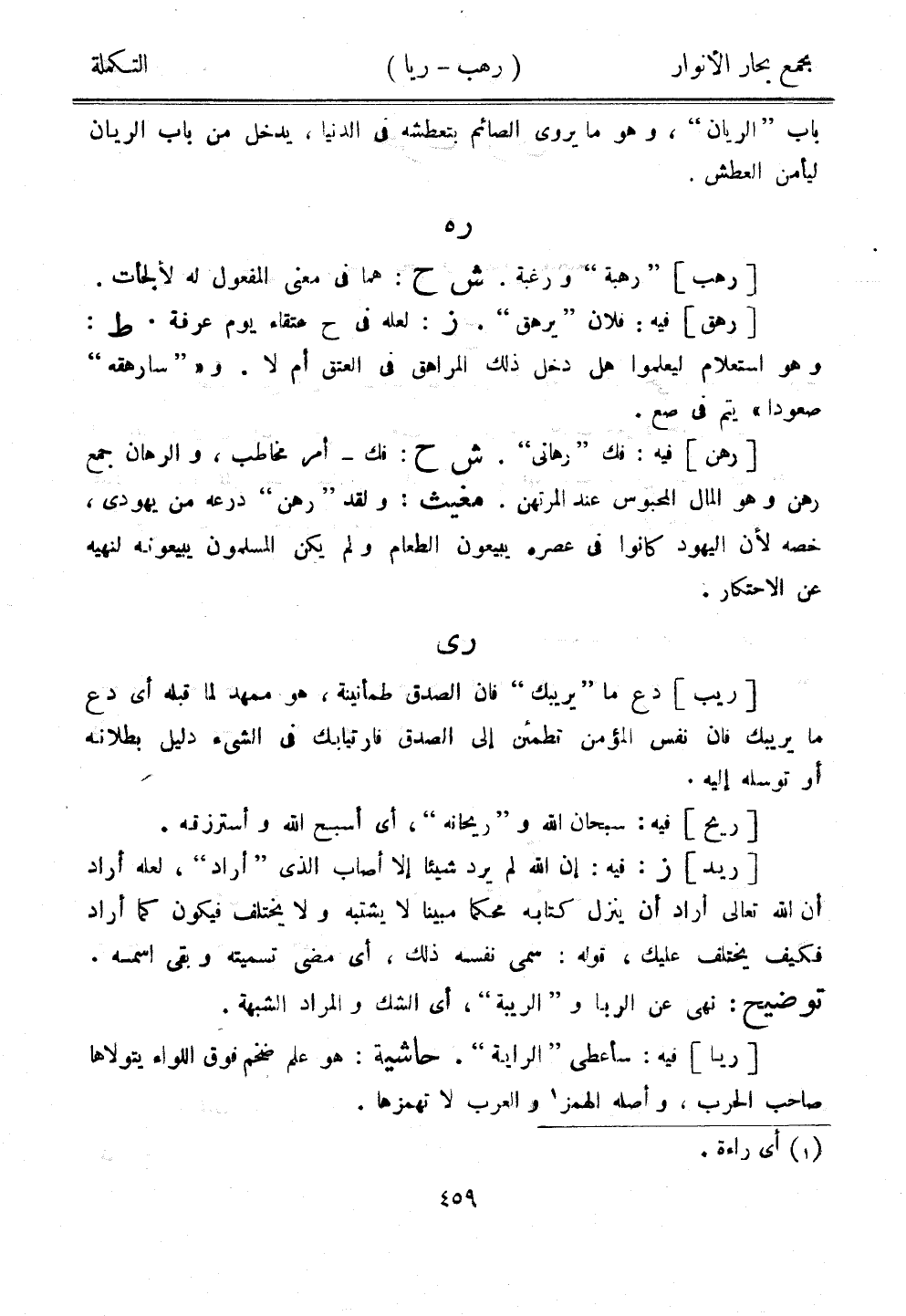 [ريد] ز: فيه: إن الله لم يرد شيئًا إلا أصاب الذي "أراد"، لعله أراد أن الله تعالى أراد أن ينزل كتابه محكمًا مبينًا لا يشتبه ولا يختلف فيكون كما أراد فكيف يختلف عليك، قوله: سمي نفسه ذلك، أي مضى تسميته وبقى اسمه. توضيح: نهى عن الربا و"الريبة"، أي الشك والمراد الشبهة.