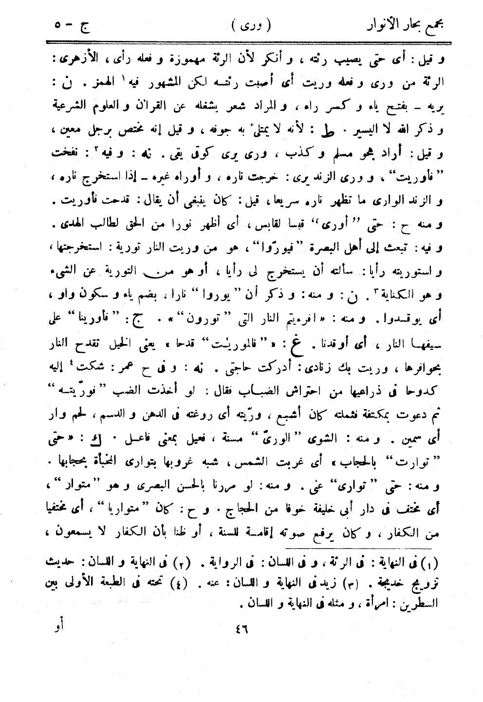 وقيل: أي حتى يصيب رئته، وأنكر لأن الرئة مهموزة وفعله رأى، الأزهري: الرئة من ورى وفعله وريت أي أصبت رئته لكن المشهور فيه الهمز. ن: يريه - بفتح ياء وكسرراء، والمراد شعر يشغله عن القرآن والعلوم الشرعية وذكر الله لا اليسير. ط: لأنه لا يمتلئ به جوفه، وقيل نه مختص برجل معين، وقيل: أراد هجو مسلم وكذب، ورى يرى كوقي يقي. نه: وفيه: نفخت "فوريت"، وورى الزند يرى: خرجت ناره، وأوراه غيره - إذا استخرج ناره، والزند الواري ما تظهر ناره سريعًا، قيل: كان ينبغي أن يقال: قدحت فأوريت. ومنه ح: حتى "أورى" قبسًا لقابس، أي أظهر نورًا من الحق لطالب الهدى. وفيه: تبعث إلى أهل البصرة "فيوروا"، هو من وريت النار تورية: استخرجتها، واستوريته رأيًا: سألته أن يستخرج لي رأيًا، أو هو من التورية عن الشيء وهو الكناية. ن: ومنه: وذكر أن "يوروا" نارًا، بضم ياء وسكون واو، أي يوقدوا. ومنه: "أفرءيتم النار التي "تورون"". ج: "فأورينا" على سيفها النار، أي أوقدنا. غ: "فالموريات" قدحا" يعني الخيل تقدح النار بحوافرها، وريت بك زنادي: أدركت حاجتي. نه: وفي ح عمر: شكت إليه كدوحًا في ذراعيها من احتراش الضباب فقال: لو أخذت الضب "فوريته" ثم دعوت بمكتفة فثملته كان أشبع، وريته أي روغته في الدهن والدسم، لحم وار أي سمين. ومنه: الشوى "الورى" مسنة، فعيل بمعنى فاعل. ك: "حتى "توارت" بالحجاب" أي غربت الشمس، شبه غروبها يتوارى المخبأة بحجابها. ومنه: حتى "توارى" عني. ومنه: لو مررنا بالحسن البصري وهو "متوار"، أي مختف في دار أبي خليفة خوفًا من الحجاج. وح: كان "متواريا"، أي مختفيًا من الكفار، وكان يرفع صوته إقامة للسنة، أو ظنًا بأن الكفار لا يسمعون،
