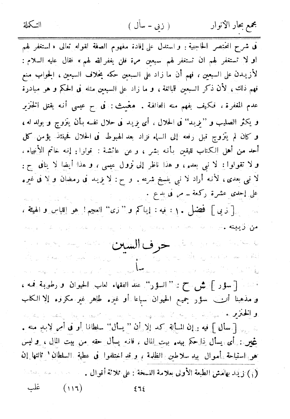 في شرح المختصر الحاجبية: واستدل على إفادة مفهوم الصفة لقوله تعالى "استغفر لهم أو لا تستغفر لهم أن تستغرف لهم سبعين مرة فلن يغفر الله لهم" فقال عليه السلام: لأزيدن على السبعين، فهم أن ما زاد على السبعين حكمه بخلاف السبعين، الجواب منع فهم ذلك، لأن ذكر السبعين للمبالغة، وما زاد على السبعين مثله في الحكم وهو مبادرة عدم المغفرة، فكيف يفهم منه المخالفة، مغيث: في ح عيسى أنه يقتل الخنزير ويكثر الصليب و"يزيد" في الحلال، أي يزيد في حلال نفسه بأن يتزوج ويولد له، كان لم يتزوج قبل رفعه إلى السماء فزاد بعد الهبوط في الحلال فحينئذ يؤمن كل أحد من أهل الكتاب لليقين بأنه بشر، وعن عائشة: قولوا: إنه خاتم الأنبياء، ولا تقولوا: لا نبي بعده، وهذا ناظر إلى نزول عيسى، وهذا أيضًا لا ينافي ح: لا نبي بعدي، لأنه أراد لا نبي ينسخ شرعه. وح: لا يزيد في رمضان ولا في غيره على إحدى عشرة ركعة - مر في بدع.
