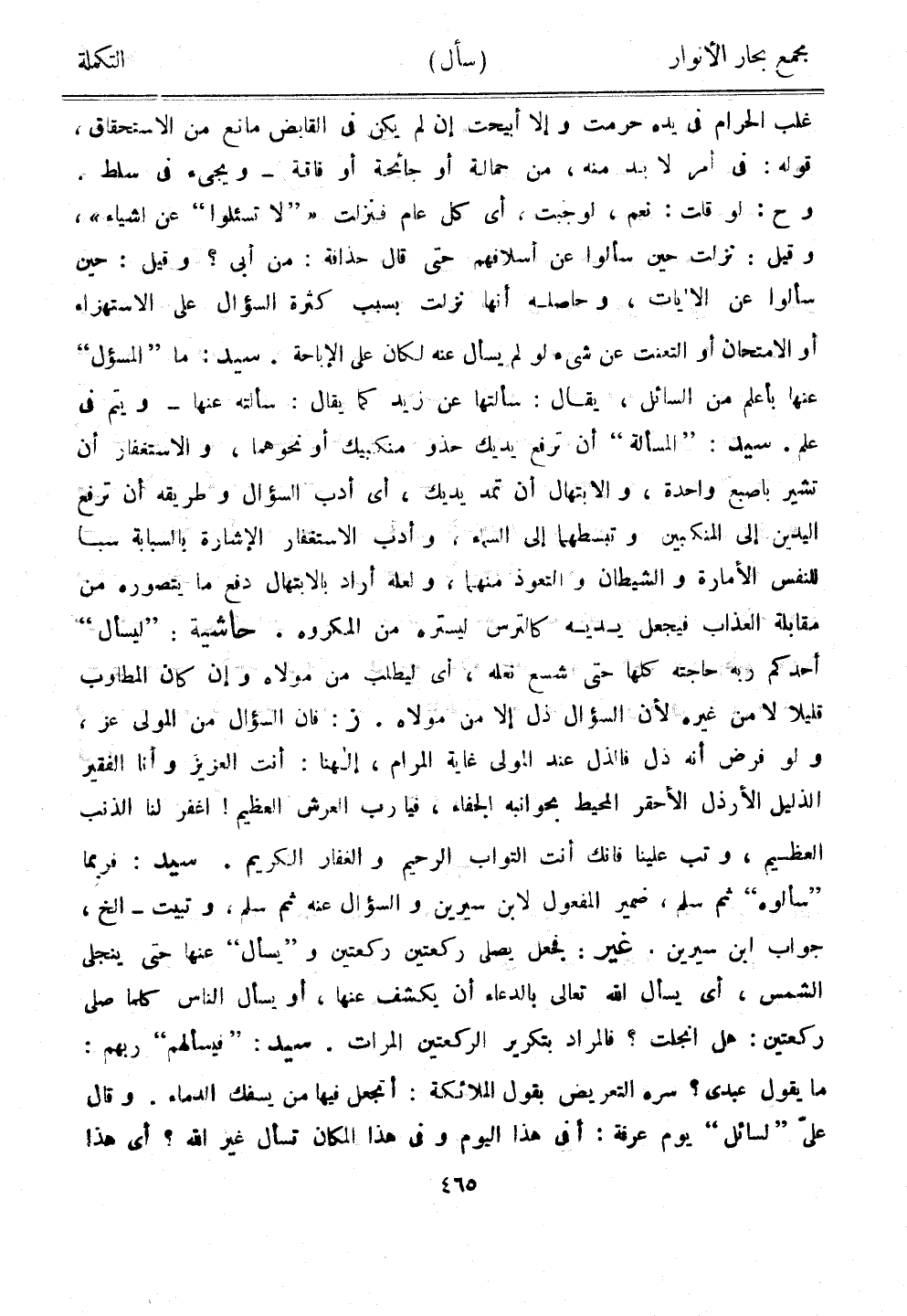 غلب الحرام في يده حرمت وإلا أبيحت إن لم يكن في القابض مانع من الاستحقاق، قوله: في أمر لابد منه، من حمالة أو جائحة أو قافة - ويجيء في سلط. وح: لو قلت: نعم، لوجبت، أي كل عام فنزلت ""لا تسئلوا" عن أشياء"، وقيل: نزلت حين سألوا عن أسلافهم حتى قال حذافة: من أبى؟ وقيل: حين سألوا عن الآيات، وحاصله أنها نزلت بسبب كثرة السؤال على الاستهزاء أو الامتحان أو التعنت عن شيء لو لم يسأل عنه لكان على الإباحة. سيد: ما "المسؤل" عنها بأعلم من السائل، يقال: سألتها عن زيد كما يقال: سألته عنها - ويتم في علم. سيد: "المسألة" أن ترفع يديك حذو منكبيك أو نحوهما، والاستغفار أن تشير بإصبع واحدة، والابتهال أن تمد يديك، أي أدب السؤال وطريقه أن ترفع اليدين إلى المنكبين وتبسطهما إلى السماء، وأدب الاستغفار الإشارة بالسبابة سبا للنفس الأمارة والشيطان والتعوذ منهما، ولعله أراد بالابتهال دفع ما يتصوره من مقابلة العذاب فيجعل يديه كالترس ليستره من المكروه. حاشية: "ليسأل" أحدكم ربه حاجته كلها حتى شسع نقله، أي ليطلب من مولاه وإن كان المطلوب قليلًا لا من غيره لأن السؤال ذل إلا من مولاه. ز: فإن السؤال من المولى عز، ولو فرض نه ذل فالذل عند المولى غاية المرام، إلاهنا: أنت العزيز وأنا الفقير الذليل الأرذل الأحقر المحيط بحوانبه الجفاء، فيا رب العرش العظيم! اغفر لنا الذنب العظيم، وتب علينا فإنك أنت التواب الرحيم والغفار الكريم. سيد: فربما "سألوه" ثم سلم، ضمير المفعول لابن سيرين والسؤال عنه ثم سلم، وتبيت - إلخ، جواب ابن سيرين. غير: فجعل يصلي ركعتين ركعتين و"يسأل" عنها حتى ينجلي الشمس، أي يسأل الله تعالى بالدعاء أن يكشف عنها، أو يسأل الناس كلما صلى ركعتين: هل انجلت؟ فالمراد بتكرير الركعتين المرات. سيد: "فيسألهم" ربهم: ما يقول عبدي؟ سره التعريض بقول الملائكة: أتجعل فيها من يسف الدماء. وقال علىّ "لسائل" يوم عرفة: أفي هذا اليوم وفي هذا المكان تسأل غير الله؟ أي هذا
