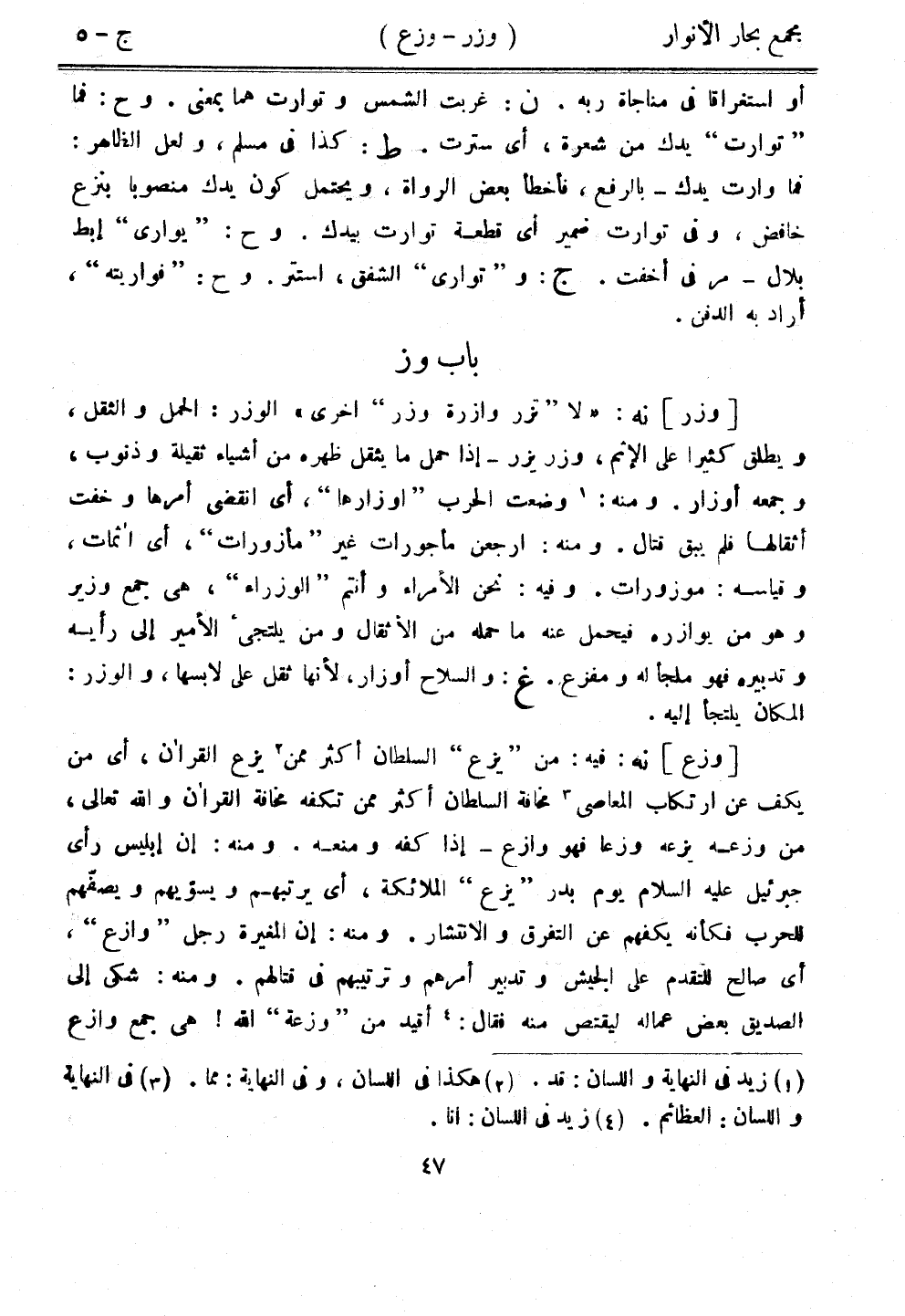 [وزر] نه: "لا "تزر وازرة وزر" أخرى" الوزر: الحمل والثقل، ويطلق كثيرًا على الإثم، وزر يزر - إذا حمل ما يثقل ظهره من أشياء ثقيلة وذنوب، وجمعه أوزار. ومنه: وضعت الحرب "أوزارها"، أي انقضى أمرها وخفت أثقالها فلم يبق قتال. ومنه: ارجعن مأجورات غير "مأذورات"، أي أثمات، وقياسه: موزورات. وفيه: نحن الأمراء وأنتم "الوزراء"، هي جمع وزير وهو من يوازره فيحمل عنه ما حمله من الأثقال ومن يلتجيء الأمير إلى رأيه وتدبيره فهو ملجأ له ومفزع. غ: والسلاح أوزار، لأنها ثقل على لابسها، والوزر: المكان يلتجأ إليه.