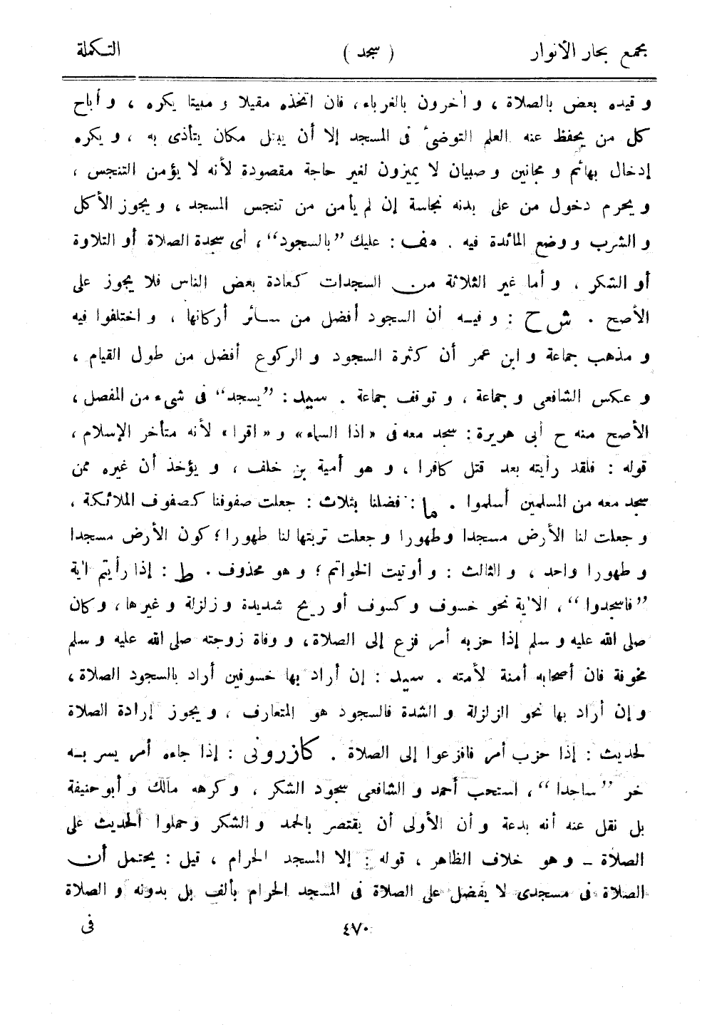 وقيده بعض بالصلاة، وآخرون بالغرباء، فن اتخذه مقيلًا ومبيتا يكره، وأباح كل من يحفظ عنه العلم التوضئ في المسجد إلا أن يبتل مكان يتأذى به، ويكره إدخال بهائم ومجانين وصبيان لا يميزون لغير حاجة مقصودة لأنه لا يؤمن التنجس، ويحرم دخول من على بدنه نجاسة إن لم يأمن من تنجس المسجد، ويجوز الأكل والشرب ووضع المائدة فيه. مف: عليك "بالسجود"، أي سجدة الصلاة أو التلاوة أو الشكر. وأما غير الثلاثة من السجدات كعادة بعض الناس فلا يجوز على الأصح. ش ح: وفيه أن السجود أفضل من سائر أركانها، واختلفوا فيه ومذهب جماعة وابن عمر أن كثرة السجود والركوع أفضل من طول القيام، وعكس الشافعي وجماعة، وتوقف جماعة. سيد: "يسجد" في شيء من المفصل، الأصح منه ح أبي هريرة: سجد معه في"إذا السماء" و"اقرأ" لأنه متأخر الإسلام، قوله: فلقد رايته بعد قتل كافرًا، وهو امية بن خلف، ويؤخذ أن غيره ممن سجد معه من المسلمين أسلموا. ما: فضلنا بثلاث: جعلت صفوفنا كصفوف الملائكة، وجعلت لنا الأرض مسجدًا وطهورًا وجعلت تربتها لنا طهورا؛ كون الأرض مسجدًا وطهورًا واحد، والثالث: وأوتيت الخواتم، وهو محذوف. ط: إذا رأيتم آية "فاسجدوا"، الآية نحو خسوف وكسوف أو رح شديدة وزلزلة وغيرها، وكان صلى الله عليه وسلم إذا حزبه أمر فزع إلى الصلاة، ووفاة زوجته صلى الله عليه وسلم مخوفة فإن أصحابه أمنة لأمته. سيد: إن أراد بها خسوفين أراد بالسجود الصلاة، وإن أراد بها نحو الزلزلة والشدة فالسجود هو المتعارف، ويجوز إرادة الصلاة لحديث: إذا حزب أمر فافزعوا إلى الصلاة. كازروني: إذا جاءه أمر يسر به خر "ساجدا"، استحب أحمد والشافعي سجود الشكر، وكرهه مالك وأبو حنيفة بل نقل عنه أنه بدعة وأن الأولى أن يقتصر بالحمد والشكر وحملوا الحديث على الصلاة - وهو خلاف الظاهر، قوله: إلا المسجد الحرام، قيل: يحتمل أن الصلاة في مسجدي لا يفضل على الصلاة في المسجد الحرام بألف بل بدونه والصلاة