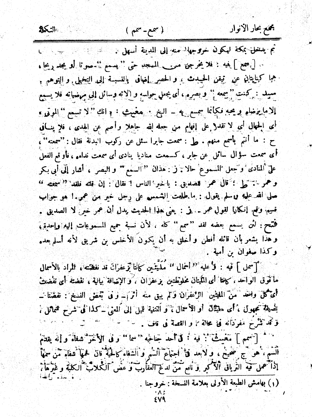 [سمع] فيه: فلا يخرجن من المسجد حتى "يسمع" صوتًا أو يجد ريحًا، هما كنايتان عن تيقن الحدثن والحصر إضافي بالنسبة إلى التخيل، والتوهم. سيد: كنت "سمعه" وبصره، أي يجعل حواسه وآلاته وسائل إلى مرضياته فلا يسمع إلا ما يرضاه ويحبه فكأنما سمع به - إلخ. مغيث: "إنك" لا تسمع" الموتى" أي الجهال أي لا تقدر على إفهام من جعله الله جاهلًا وأصم عن الهدى، فلا ينافي ح: ما أنتم بأسمع منهم. ط: سمعت جابرًا سئل عن ركوب البدنة فقال: "سمعته"، أي سمعت سؤال سائل عن جابر، كسمعت مناديًا ينادي أي سمعت نداءه، فأوقع الفعل على المنادي وجعل المسموع حالًا. ز: هذان "السمع" والبصر، أشار إلى أبي بكر وعمر. ط: قال عمر للصديق: يا خير الناس! فقال: إن قلته فلقد "سمعته" صلى الله عليه وسلم يقول: ما طلعت الشمس على رجل خير من عمر! هو جواب قسم وقع إنكارًا لقول عمر. ز: يعني هذا الحديث بدل أن عمر خير لا الصديق. فتح: لئن يسمع بعضه لقد "سمع" كله، لأن نسبة جميع المسموعات إليه واحدة، وهذا يشعر بأن قائله أفطن وأخلق به أن يكون الأخنس بن شريق لأنه أسلم بعده وكذا صفوان بن أمية.
