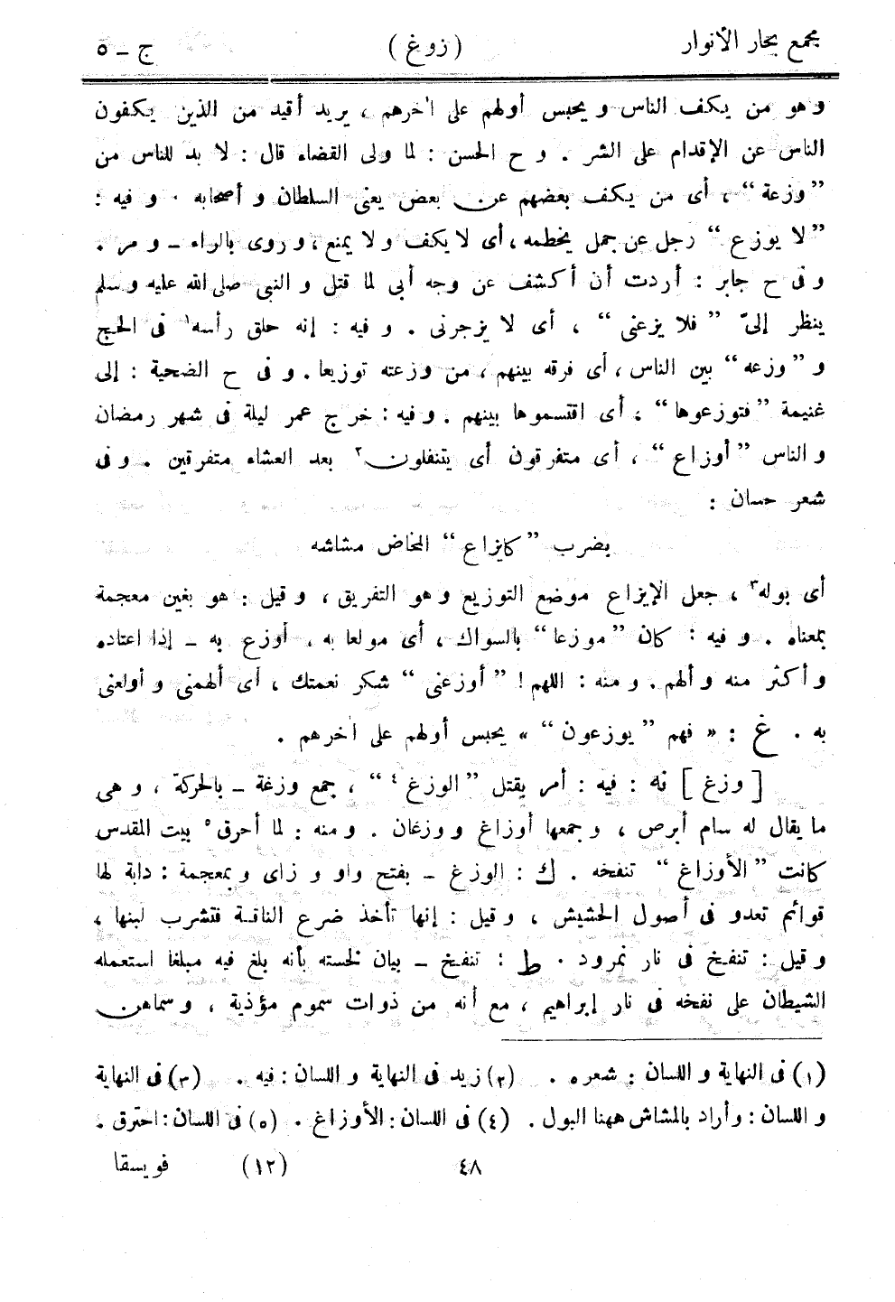 وهو من يكف الناس ويحبس أولهم على أخرهم، يريد أقيد منالذين يكفون الناس عن الإقدام على الشر. وح الحسن: لما ولى القضاء قال: لابد للناس من "وزعة"، أي من يكف بعضهم عن بعض يعني السلطان وأصحابه. وفيه: "لا يوزع" رجل عن جمل يخطمه، أي لا يكف ولا يمنع، وروى بالراء - ومر. وفي ح جابر: أردت أن أكشف عن وجه أبي لما قتل والنبي صلى الله عليه وسلم ينظر إليّ "فلا يزعني"ن أي لا يزجرني. وفيه: إنه حلق رأسه في الحج و"وزعه" بين الناس، أي فرقه بينهم، من وزعته توزيعًا. وفي ح الضحية: إلى غنيمة "فتوزعوها"، أي اقتسموها بينهم. وفيه: خرج عمر ليلة في شهر رمضان والناس "أوزاع"، أي متفرقون أي يتنفلون بعد العشاء متفرقين. وفي شعر حسان: