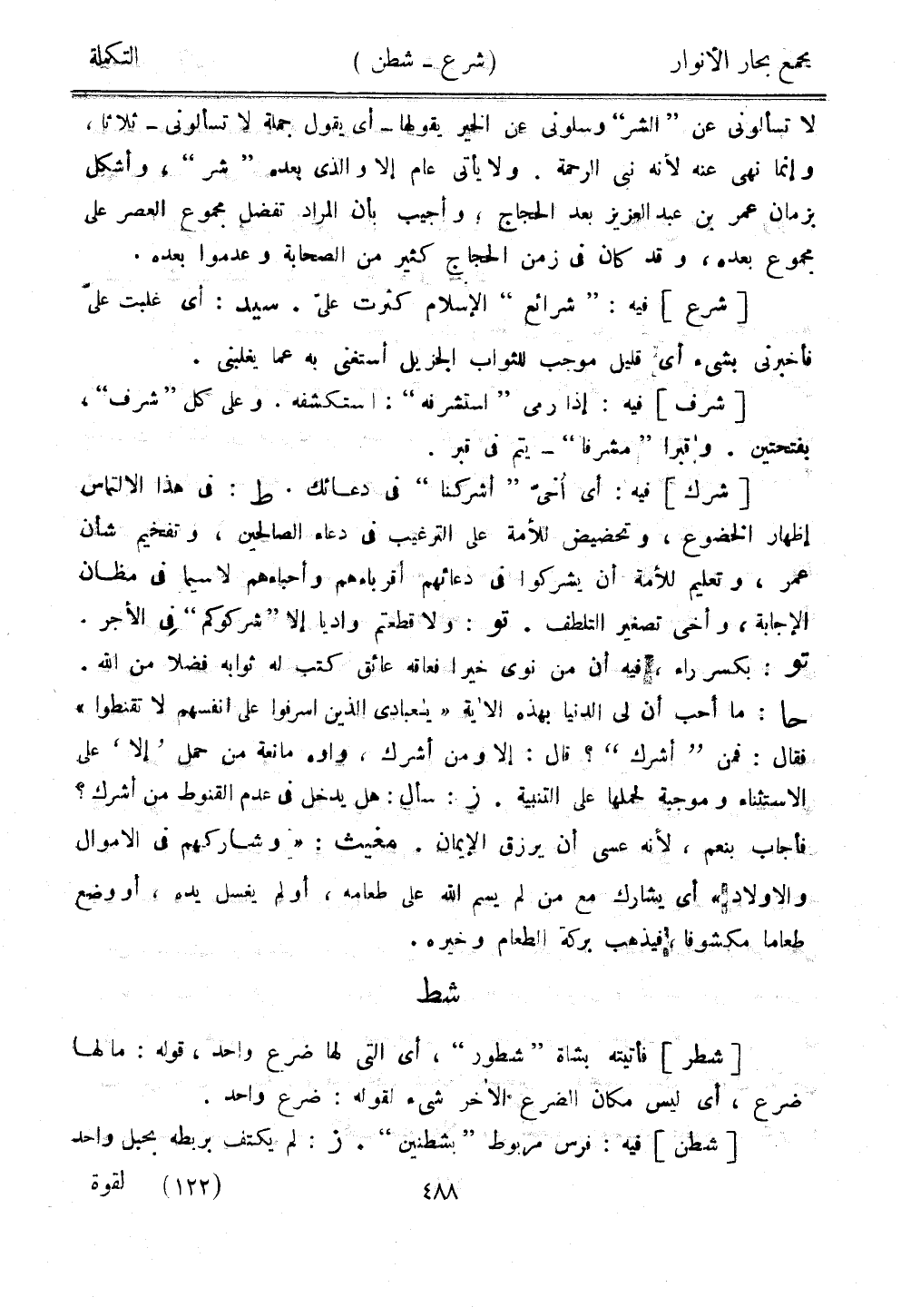 [شرك] فيه: أي أخي "أشركنا" في دعائك. ط: في هذا الالتماس إظهار الخضوع، وتحضيض للأمة على الترغيب في دعاء الصالحين، وتفخيم شأن عمر، وتعليم للأمة أن يشركوا في دعائهم أقرباءهم وأحباءهم لا سيما في مظان الإجابة، وأخى تصغير التلطف. تو: ولا قطعتم واديًا إلا "شركوكم" في الأجر. تو: بكسر راء، فيه أن من نوى خيرًا فعاقه عائق كتب له ثوابه فضلًا من الله. حا: ما أحب أن لي الدنيا بهذه الآية "يا عبادي الذين أسرفوا على أنفسهم لا تقنطوا" فقال: فمن "أشرك"؟ قال: إلا ومن أشرك، واوه مانعة من حمل "إلا" على الاستثناء وموجبة لحملها على التنبيه. ز: سأل: هل يدخل في عدم القنوط من أشرك؟ فأجاب بنعم، لأنه عسى أن يرزق الإيمان. مغيث: "وشاركهم في الأموال والأولاد" أي يشارك مع من لم يسم الله على طعام، أو لم يغسل يده، أو وضع طعامًا مكشوفًا فيذهب بركة الطعام وخبره.
