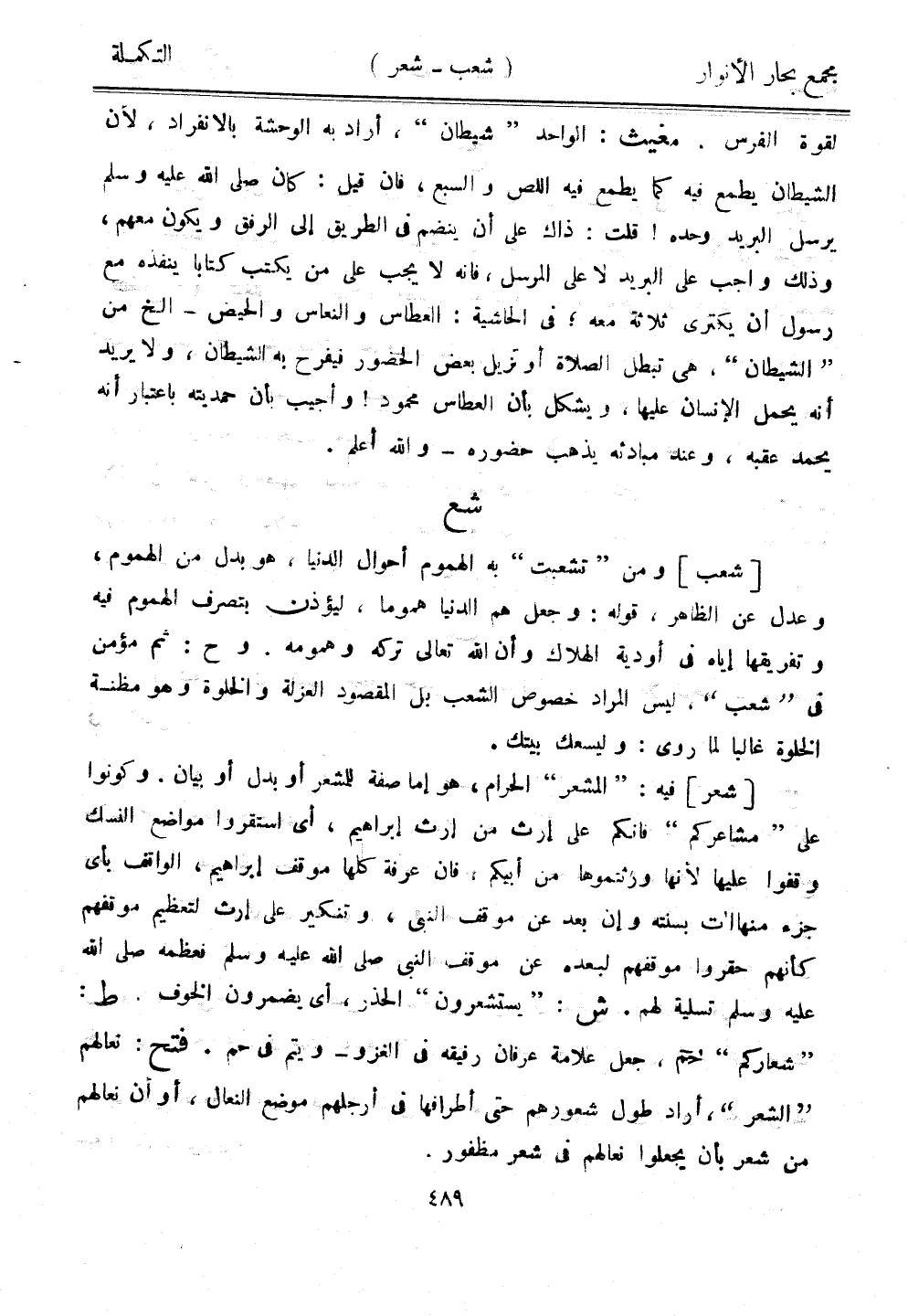 [شعر] فيه: "المشعر" الحرام، هو إما صفة للمشعر أو بدل أو بيان. وكونوا على "مشاعركم" فإنكم على إرث من إرث إبراهيم، أي استقروا مواضع النسك وقفوا عليها لأنها ورثتموها من أبيكم، فإن عرفة كلها موقف إبراهيم، الواقف بأي جزء منها آت بسنته وإن بعد عن موقف النبي، وتنكير على إرث لتعظيم موقفهم كأنهم حقروا موقفهم لبعده عن موقف النبي صلى الله عليه وسلم فعظمه صلى الله عليه وسلم تسلية لهم. ش:"يستشعرون" الحذر، أي يضمرون الخوف. ط: "شعاركم" ختم، جعل علامة عرفان رفيقه في الغزو- ويتم في حم. فتح: نعالهم "الشعر"، أراد طول شعورهم حتى أطرافها في أرجلهم موضع النعال، أو أن نعالهم من شعر بأن يجعلوا نعالهم في شعر مظفور.