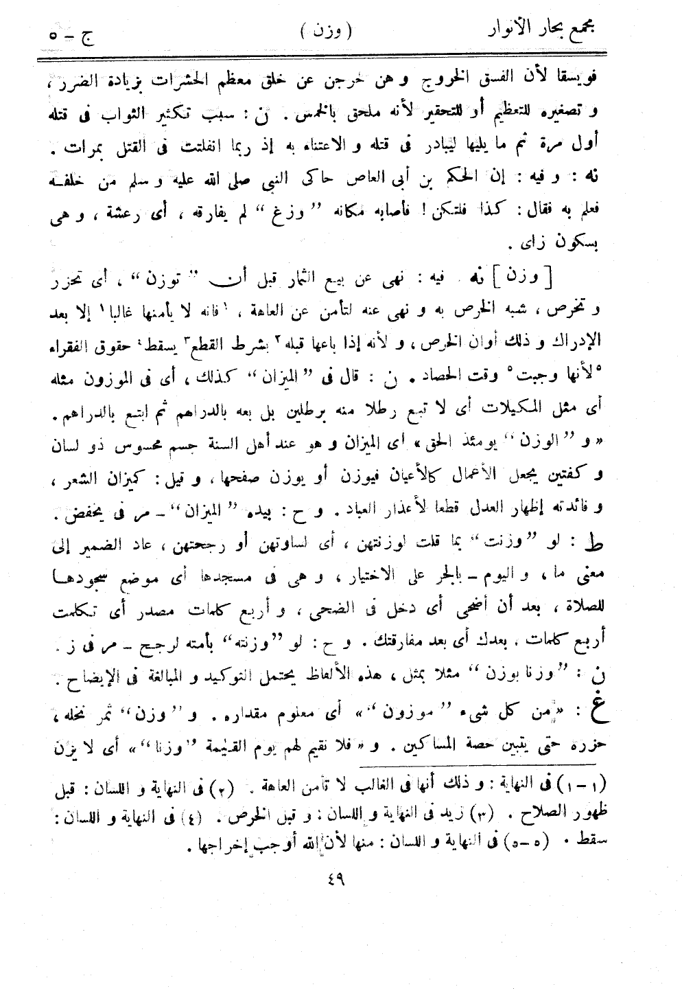 [وزن] نه: فيه: نهى عن بيع الثمار قبل أن "توزن"، أي تحرز وتخرص، شبه الخرص به ونهى عنه لتأمن عن العاهة، فإنه لا يأمنها غالبًا إلا بعد الإدراك وذل وان الخرص، ولأنه إذا باعها قبله بشرط القطع يسقط حقوق الفقراء لأنها وجبت وقت الحصاد. ن: قال في "الميزان" كذلك، أي في الموزون مثله أي مثل المكيلات أي لا تبع رطلًا منه برطلين بل بعه بالدرهم ثم ابتع بالدراهم. "و"الوزن" يومئذ الحق" أي الميزان وهو عند أهل السنة جسم محسوس ذو لسان وكفتين يجعل الأعمال كالأعيان فيوزن أو يوزن صفحها، وقيل: كميزان الشعر، وفائدته إظهار العدل قطعًا لأعذار العباد. وح: بيده "الميزان" - مر في يخفض. ط: لو "وزنت" بما قلت لوزنتهن، أي لساوتهن أو رجحتهن، عاد الضمير إلى معنى ما، واليوم - بالجر على الاختيار، وهي في مسجدها أي موضع سجودها للصلاة، بعد أن أضحى أي دخل في الضحى، وأربع كلمات مصدر أي تكلمت أربع كلمات، بعدك أي بعد مفارقتك. وح: لو "وزنته" بأمته لرجح - مر في ز. ن: "وزنا بوزن" مثلًا بمثل، هذه الألفاظ يحتمل التوكيد والمبالغة في الإيضاح. غ: "من كل شيء "موزون"" أي معلوم مقداره. و"وزن" ثمر نخله، حزره حتى يتبين حصة المساكين. و"فلا نقيم لهم يوم القيامة "وزنا"" أي لا يزن