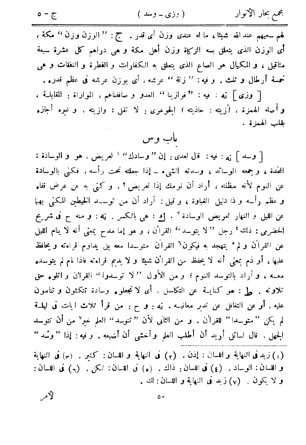 [وسد] نه: فيه: قال لعدي: إن "وسادك" لعريض، هو والوسادة: المخدة، وجمعه الوسائد، وسدته الشيء - إذا جعلته تحت رأسه، فكنى بالوسادة عن النوم لأنه مظنته، أراد أن نومك إذا لعريض، وكنى به عن عرض قفاه وعظم رأسه وذا دليل الغباوة، وقيل: أراد أن من توسد الخيطين المكنى بهما عن الليل والنهار لعريض الوسادة. ك: هي بالكسر. نه: ومنه ح في شريح الحضرمي: ذلك رجل "لا يتوسد" القرآن، وهو إما مدح بمعنى أنه لا ينام الليل عن القرآن ولم يتهجد به فيكون القرآن متوسدًا معه بل يداوم قراءته ويحاف عليها، أو ذم بمعنى أنه لا يحفظ من القرآن شيئًا ولا يديم قراءته فإذا نام لم يتوسده معه، وأراد بالتوسد النوم، ومن الأول "لا توسدوا" القرآن واتلوه حق تلاوته. ط: هو كناية عن التكاسل، أي لا تجعلوه وسادة تتكئون وتنامون عليه، أو عن التغافل عن تدبر معانيه. نه: وح: من قرأ ثلاث آيات في ليلة لم يكن "متوسدًا" للقرآن. ومن الثاني لأن "تتوسد" العلم خير من أن تتوسد الجهل، قال لسائل أريد أن أطلب العلم وأخشى أن أضيعه. وفيه: إذا "وسد"
