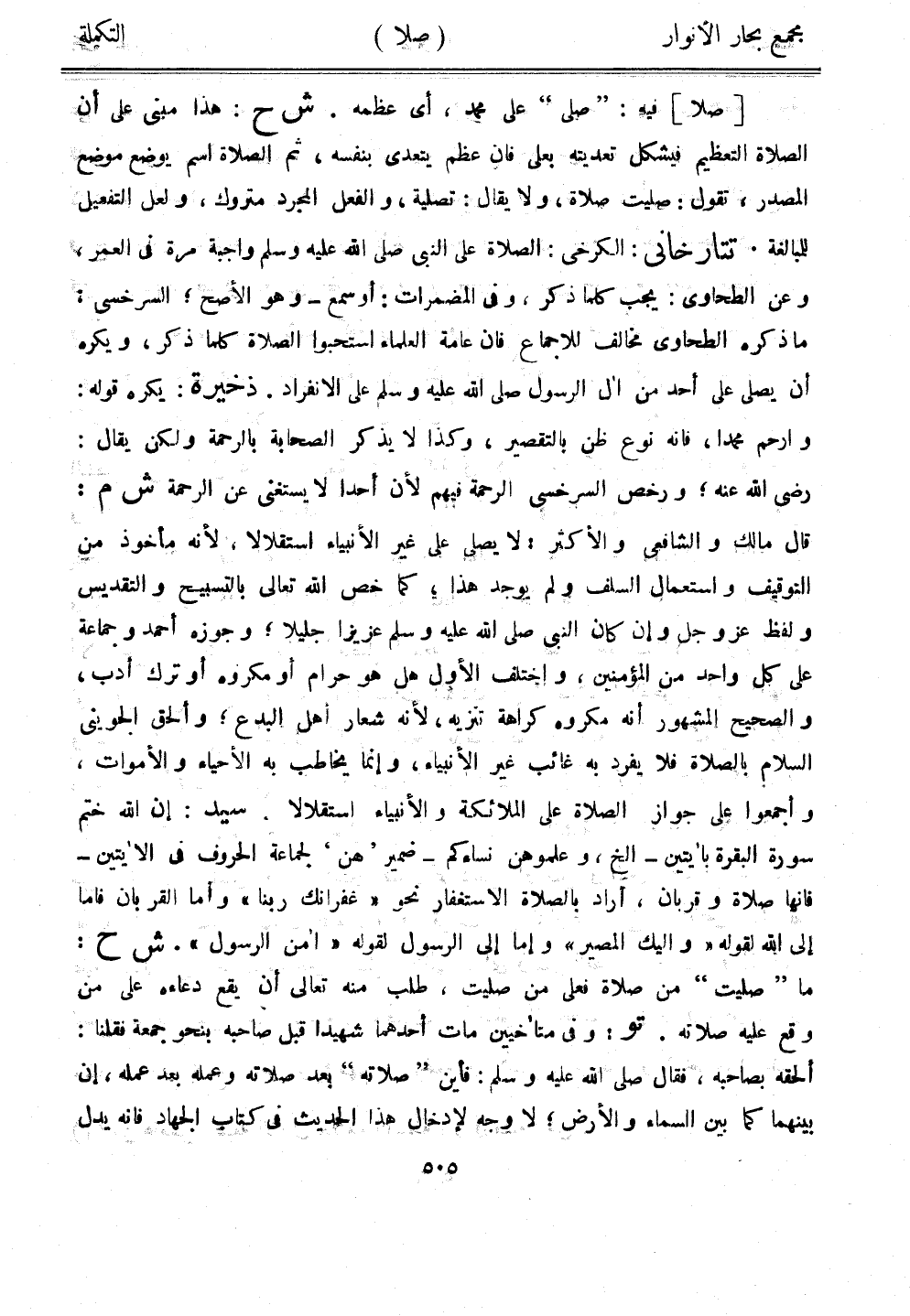 [صلا] فيه: "صلى" على محمد، أي عظمه. ش ح: هذا مبني على أن الصلاة التعظيم فيشكل تعديته بعلى فإن عظم يتعدى بنفسه، ثم الصلاة سام يوضع موضع المصدر، تقول: صليت صلاة، ولا يقال: تصلية، والفعل المجرد متروك، ولعل التفعيل للمبالغة. تتارخاني: الكرخي: الصلاة على النبي صلى الله عليه وسلم واجبة مرة في العمر، وعن الطحاوي مخالف للإجماع فإن عامة العلماء استحبوا الصلاة كلما ذكر، ويكره أن يصلي على أحد من آل الرسول صلى الله عليه وسلم على الانفراد. ذخيرة: يكره قوله: وارحم محمدًا، فإنه نوع ظن بالتقصير، وكذا لا يذكر الصحابة بالرحمة ولكن يقال: رضي الله عنه، ورخص السرخسي الرحمة فيهم لأن أحدًا لا يستغني عن الرحمة ش م: قال مالك والشافعي والأكثر: لا يصلي على غير الأنبياء استقلالًا، لأنه مأخوذ من التوقيف واستعمال السلف ولم يوجد هذا، كما خص الله تعالى بالتسبيح والتقديس ولفظ عز وجل وإن كان النبي صلى الله عليه وسلم عزيزًا جليلًا؛ وجوزه أحمد وجماعة على كل واحد من المؤمنين، واختلف الأول هل هو حرام أو مكروه أو ترك أدب، والصحيح المشهور أنه مكروه كراهة تنزيه، لأنه شعار أهل البدع، وألحق الجويني السلام بالصلاة فلا يفرد به غائب غير الأنبياء، وإنما يخاطب به الأحياء والأموات، وأجمعوا على جواز الصلاة على الملائكة والأنبياء استقلالا. سيد: إن الله ختم سورة البقرة بآيتين- إلخ، وعلموهن نساءكم - ضمير "هن" لجماعة الحروف في الآيتين- فإنها صلاة وقربان، أراد بالصلاة الاستغفار نحو "غفرانك ربنا" وأما القربان فأما إلى الله لقوله "وإليك المصير" وإما إلى الرسول لقوله "أمن الرسول". ش ح: ما "صليت" من صلاة فعلى من صليت، طلب منه تعالى أن يقع دعاءه على من وقع عليه صلاته. تو: وفي متأخيين مات أحدهما شهيدًا قبل صاحبه بنحو جمعة فقلنا: ألحقه بصاحبه، فقال صلى الله عليه وسلم: فأين "صلاته" بعد صلاته وعمله بعد عمله، إن بينهما كما بين السماء والأرض؛ لا وجه لإدخال هذا الحديث في كتاب الجهاد فإنه يدل