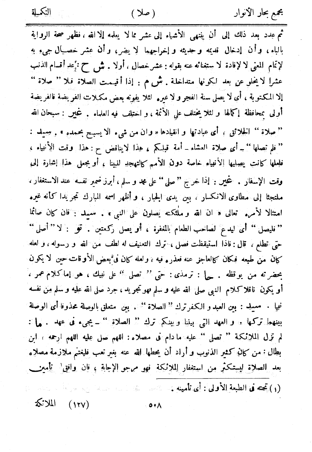 ثم عدد بعد ذلك إلى أن ينتهي الأشياء إلى عشر مما لا يعلمه إلا الله، فظهر صحة الرواية بالباء، وأن إدخال قديمه وحديثه وإخراجهما لا يضر، وأن عشر خصال جيء به لإتمام المعنى لا لإفادة لاستغنائه عنه بقوله: عشر خصال، أولا. ش ح: عد أقسام الذنب عشرًا لا يخلو عن بعد لكونها متداخلة. ش م: إذا أقيمت الصلاة فلا "صلاة" إلا المكتوبة، أي لا يصلي سنة الفجر ولا غيره لئلا يفوته بعض مكملات الفريضة فالفريضة أولى بمحافظة إكمالها ولئلا يختلف على الأئمة، واختلف فيه العلماء. غير: سبحان الله "صلاة" الخلائق، أي عبادتها وانقيادها "وإن من شيء إلا يسبح بحمده". سيد: "فلم تصلها" - أي صلاة العشاء - أمة قبلكم، هذا لا يناقض ح: هذا وقت الأنبياء، فلعلها كانت يصليها الأنبياء خاصة دون الأمم كالتهجد لنبينا، أو يجعل هذا إشارة إلى وقت الإسفار. غير: إذا خرج "صلى" على محمد وسلم، أبرز ضمير نفسه عند الاستغفار، ملتجئنا إلى مطاوي الانكسار، بين يدي الجبار، وأظهر اسمه المبارك تجريدًا كأنه غيره امتثالًا لأمره تعالى "أن الله وملائكته يصلون على النبي". سيد: فإن كان صائمًا "فليصل" أي ليدع لصاحب الطعام بالمغفرة، أو يصل ركعتين. تو: لا "أصلي" حتى تطلع، قال: فإذا استيقظت فصل، ترك التعنيف له لطف من الله ورسوله، ولعله كان من طبعه فكان كالعاجز عنه فعذره فيه، ولعله كان في بعض الأوقات حين لا يكون بحضرته من يوقظه. حا: ترمذي: حتى "تصلي" على نبيك، هو إما كلام عمر، أو يكون ناقلًا كلام النبي صلى الله عليه وسلم فهو تجريد، جرد صلى الله عليه وسلم من نفسه نبيًا. سيد: بين العبد والكفر ترك "الصلاة". بين متعلق بالوصلة محذوفًا أي الوصلة بينهما تركها، والعهد التي بيننا وبينكم ترك "الصلاة" - يجيء في عهد. ما: لم تزل الملائكة "تصلي" عيه ما دام في مصلاه: اللهم صل عليه اللهم ارحمه، ابن بطال: من كان كثير الذنوب وأراد أن يحطها الله عنه بغير تعب فليغتنم ملازمة مصلاه بعد الصلاة ليستكثر من استغفار الملائكة فهو مرجو الإجابة، فإن وافق تأمين
