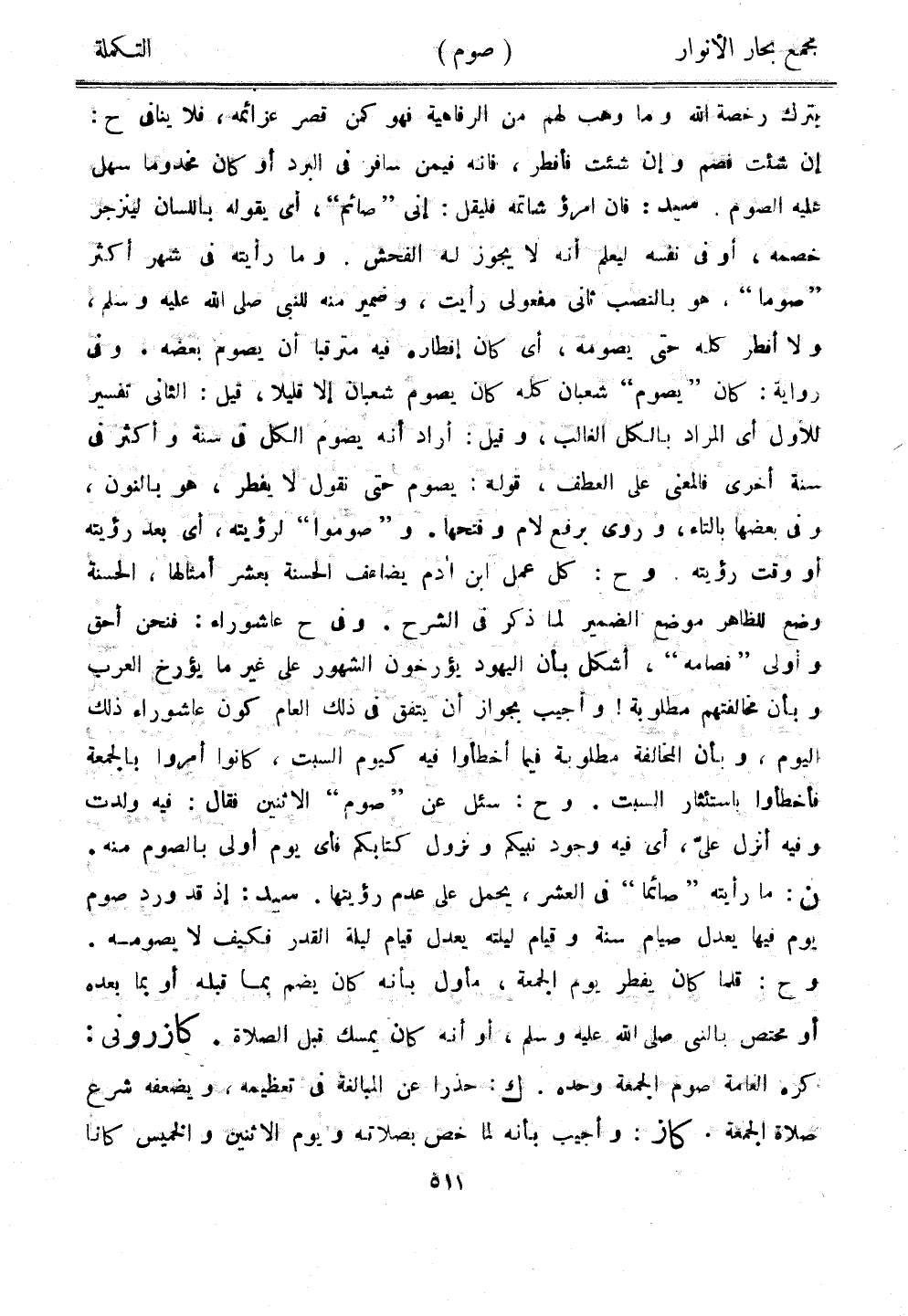 بترك رخصة الله وما وهب لهم من الرفاهية فهو من صر عزائمه، فلا ينافي ح: إنشئت فصم وإن شئت فأفطر، فإنه فيمن سافر في البرد أو كان مخدومًا سهل عليه الصوم. سيد: فإن امرؤ شاتمه فليقل: إني "صائم"، أي يقوله باللسان لينزجر خصمه، أو في نفسه ليعلم أنه لا يجوز له الفحش. وما رأيته في شهر أكثر "صومًا"، هو بالنصب ثاني مفعولي رأيت، وضمير منه للنبي صلى الله عليه وسلم، ولا أفطر كله حتى يصومه، أي كان إفطاره فيه مترقبًا أن يصوم بعضه. وفي رواية: كان "يصوم" شعبان كله كان يصوم شعبان إلا قليلا، قيل: الثاني تفسير للأول أي المراد بالكل الغالب، وقيل: أراد أن يصوم الكل في سنة وأكثر في سنة أخرى فالمعنى على العطف، قوله: يصوم حتى نقول لا يفطر، هو بالنون، وفي بعضها بالتاء، وروى برفع لام وفتحها. و"صوموا" لرؤيته، أي بعد رؤيته أو وقت رؤيته. وح: كل عمل ابن آدم يضاعف الحسنة بعشر أمثالها، الحسنة وضع للظاهر موضع الضمير لما ذكر في الشرح. وفي ح عاشوراء: فنحن أحق وأولى "فصامه"ن أشكل بأن اليهود يؤرخون الشهور على غير ما يؤرخ العرب وبأن مخالفتهم مطلوبة! وأجيب بجواز أن يتفق في ذلك العام كون عاشوراء ذلك اليوم، وبأن المخالفة مطلوبة فيما أخطأوا فيه كيوم السبت، كانوا أمروا بالجمعة فأخطأوا باستئثار السبت. وح: سئل عن "صوم" الاثنين فقال: فيه ولدت وفيه أنزل عليّ، أي فيه وجود نبيكم ونزول كتابكم فأي يوم أولى بالصوم منه. ن: ما رأيته "صائمًا" في العشر، يحمل على عدم رؤيتها. سيد: إذ قد ورد صوم يوم فيها يعدل صيام سنة وقيام ليلته يعدل قيام ليلة القدر فكيف لا يصومه. وح: قلما كان يفطر يوم الجمعة، مأول بأنه كان يضم بما قبله أو بما بعده أو مختص بالنبي صلى الله عليه وسلم، أو أنه كان يمسك قبل الصلاة. كازروني: كره العامة صوم الجمعة وحده. ك: حذرًا عن المبالغة في تعظيمه، ويضعفه شرع صلاة الجمعة. كاز: وأجيب بأنه لما خص بصلاته ويوم الاثنين والخميس كانا