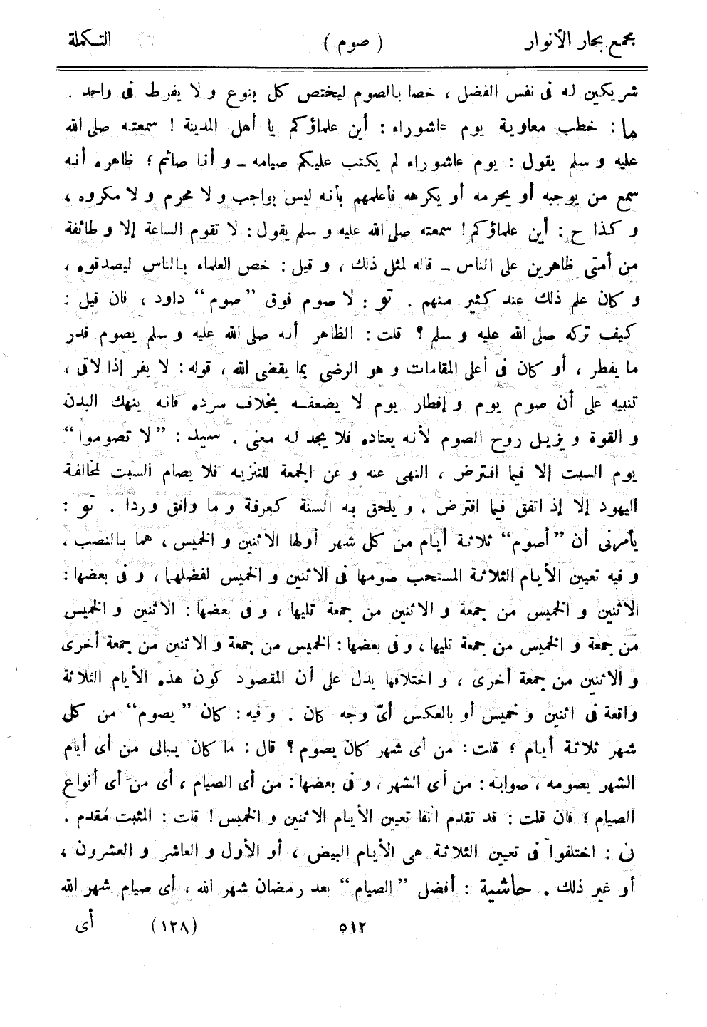 شريكين له في نفس الفضل، خصا بالصوم ليختص كل بنوع ولا يفرط في واحد. ما: خطب معاوية يوم عاشوراء: أين علماؤكم يا أهل المدينة! سمعته صلى الله عليه وسلم يقول: يوم عاشوراء لم يكتب عليكم صيامه - وأنا صائم؛ ظاهره أنه سمع من يوجبه أو يحرمه أو يكرهه فأعلمهم بأنه يس بواجب ولا محرم ولا مكروه، وكذا ح: أين علماؤكم! سمعته صلى الله عليه وسلم يقول: لا تقوم الساعة إلا وطائفة من أمتي ظاهرين على الناس - قاله لمثل ذلك، وقيل: خص العلماء بالناس ليصدقوه، وكان علم ذلك عند كثير منهم. تو: لا صوم فوق "صوم" داود، فإن قيل: كيف تركه صلى الله عليه وسلم؟ قلت: الظاهر أنه صلى الله عليه وسلم يصوم قدر ما يفطر، أو كان في أعلى المقامات وهو الرضى بما يقضي الله، قوله: لا يفر إذا لاقى، تنبيه على أن صوم يوم وإفطار يوم لا يضعفه بخلاف سرده فإنه ينهك البدن والقوة ويزيل روح الصوم لأنه يعتاده فلا يجد له معنى. سيد:"لا تصوموا" يوم السبت إلا فيما افترضن النهي عنه وعن الجمعة للتنزيه فلا يصام السبت لمخالفة اليهود إلا إذا اتفق فيما افترضن ويلحق به السنة كعرفة وما وافق وردا. تو: يأمرني أن "أصوم" ثلاثة أيام من كل شهر أولها الاثنين والخميس، هما بالنصب، وفيه تعيين الأيام الثلاثة المستحب صومها في الاثنين والخميس لفضلهما، وفي بعضها: الاثنين والخميس من جمعة والاثنين من جمعة تليها، وفي بعضها: الاثنين والخميس من جمعة والخميس من جمعة تليها، وفي بعضها: الخميس من جمعة والاثنين من جمعة أخرى والاثنين من جمعة أخرى، واختلافها يدل على أن المقصود كون هذه الأيام الثلاثة واقعة في اثنين وخميس أو بالعكس أي وجه كان. وفيه: كان "يصوم" من كل شهر ثلاثة أيام، قلت: من أي شهر كان يصوم؟ قال: ما كان يبالي من أي أيام الشهر يصومه، صوابه: من أي الشهر، وفي بعضها: من أي الصيام، أي من أي أنواع الصيام؛ فإن قلت: قد تقدم آنفًا تعيين الأيام الاثنين والخميس! قلت: المثبت مقدم. ن: اختلفوا في تعيين الثلاثة هي الأيام البيض، أو الأول والعاشر والعشرون، أو غير ذلك. حاشية: أفضل "الصيام" بعد رمضان شهر الله، أي صيام شهر الله