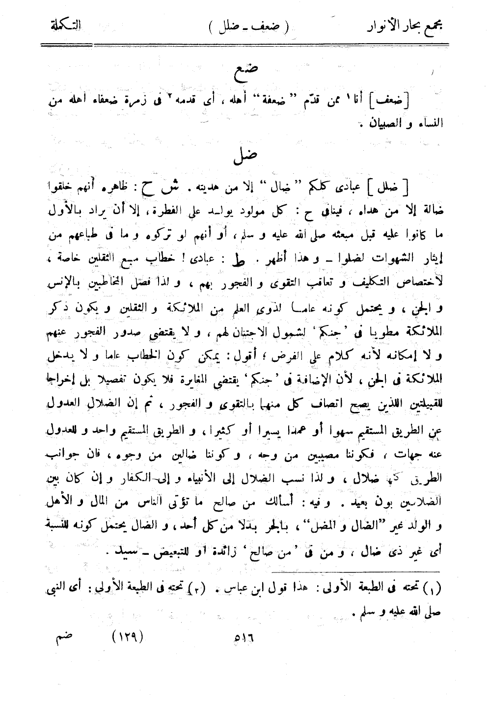 [ضلل] عبادي كلكم "ضال" إلا من هديته. ش ح: ظاهره أنهم خقوا ضالة إلا من هداه، فينافي ح: كل مولود يولد على الفطرة، إلا أن يراد بالأول ما كانوا عليه قبل مبعثه صلى الله عليه وسلم، أو أنهم لو تركوه وما في طباعهم من إيثار الشهوات لضلوا - وهذا أظهر. ط: عبادي! خطاب مع الثقلين خاصة، لاختصاص التكليف وتعاقب التقوى والفجور بهم، ولذا فصل المخاطبين بالإنس والجن، ويحتمل كونه عامًا لوي العلم من الملائكة والثقلين ويكون ذكر الملائكة مطويًا في "جنكم" لشمول الاجتنان لهم، ولا يقتضي صدور الفجور عنهم ولا إمكانه لأنه كلام على الفرض؛ أقول: يمكن كون الخطاب عامًا ولا يدخل الملائكة في الجن، لأن الإضافة في "جنكم" يقتضي المغايرة فلا يكون تفصيلًا بل إخراجًا للقبيلتين اللذين يصح اتصاف كل منهما بالتقوى والفجور، ثم إن الضلال العدول عن الطريق المستقيم سهوًا أو عمدًا يسيرًا أو كثيرًا، والطريق المستقيم واحد وللعدول عنه جهات، فكونتا مصيبين من وجه، وكونتا ضالين من وجوه، فإن جوانب الطريق كلها ضلال، ولذا نسب الضلال إلى الأنبياء وإلى الكفار وإن كان بين الضلالين بون بعيد. وفيه: أسألك من صالح ما تؤتى الناس من المال والأهل والولد غير "الضال والمضل"، بالجر بدلًا من كل أحد، والضال يحتمل كونه للنسبة أي غير ذي ضال، ومن في "من صالح" زائدة أو للتبعيض - سيد.