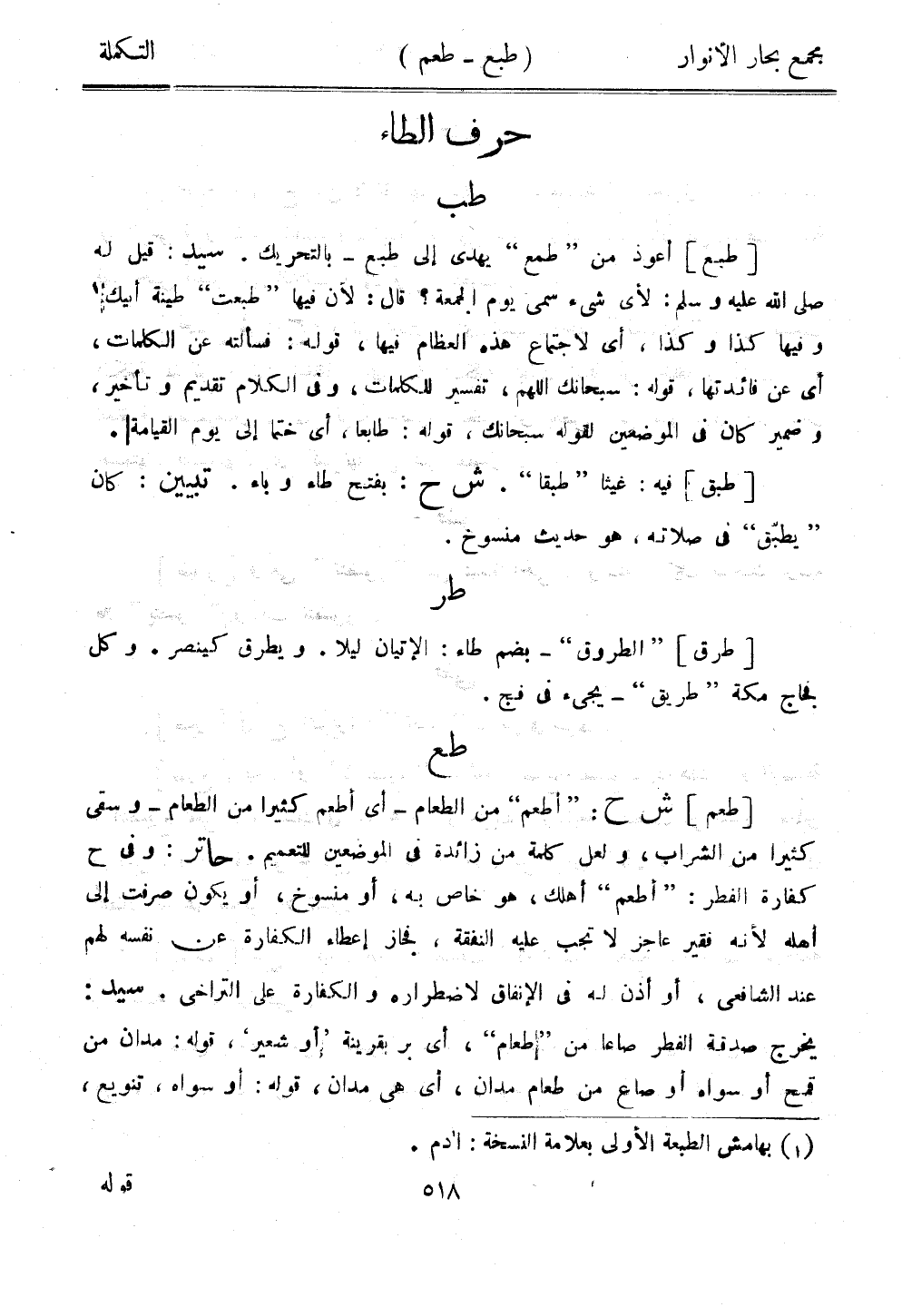 [طعم] ش ح: "أطعم" من الطعام- أي أطعم كثيرًا من الطعام - وسقى كثيرًا من الشراب، ولعل كلمة من زائدة في الموضعين للتعميم. حاتر: وفي ح كفارة الفطر: "أطعم" أهلك، هو خاص به، أو منسوخ، أو يكون صرفت إلى أهله لأنه فقير عاجز لاتجب عليه النفقة، فجاز إعطاء الكفارة عن نفسه لهم عند الشافعي، أو أذن له في الإنفاق لاضطراره والكفارة على التراخي. سيد: يخرج صدقة الفطر صاعًا من "طعام"، أي بر بقرينة "أو شعير"، قوله: مدان من قمح أو سواه أو صاع من طعام مدان، أي هي مدان، قوله: أو سواه، تنويع،