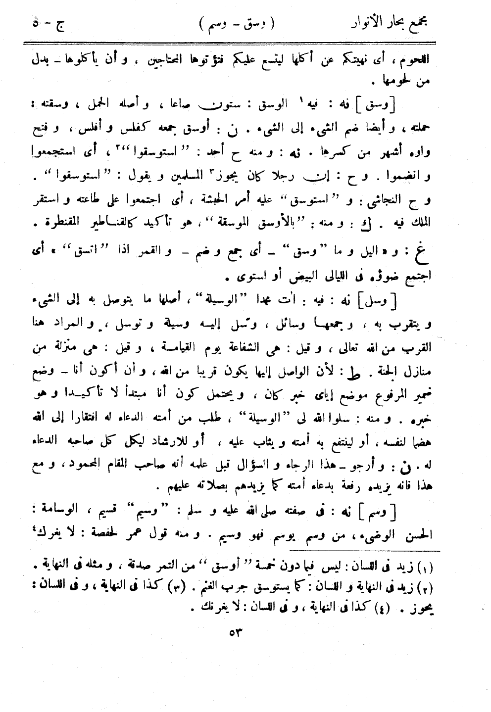 [وسق] نه: فيه الوسق: ستون صاعا، وأصله الحمل، وسقته: حملته، وأيضًا ضم الشيء إلى الشيء. ن: أوسق جمعه كفلس وأفلس، وفتح واوه أشهر من كسرها. نه: ومنه ح أحد: "استوسقوا"، أي استجمعوا وانضموا. وح: إن رجلًا كان يجوز المسلمين ويقول: "استوسقوا". وح النجاشي: و"استوسق" عليه أمر الحبشة، أي اجتمعوا على طاعته واستقر الملك فيه. ك: ومنه: "بالأوسق الموسقة"، هو تأيد كالقناطير المقنطرة. غ: و"اليل وما "وسق" - أي جمع وضم - والقمر إذا "اتسق"" أي اجتمع ضوؤه في الليالي البيض أو استوى.