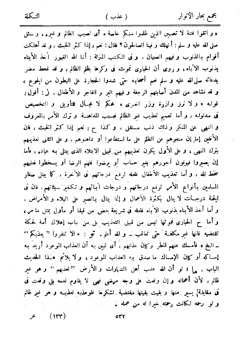 "واتقوا فتنة لا تصيبن الذين ظلموا منكم خاصة" أي تصيب الظالم وغيره، وسئل صلى الله عليه وسلم: أنهلك وفينا الصالحون؟ فقال: نعم، إذا كثر الخبث، وقد أهلكت أقوام بالذنوب وفيهم الصبيان، وفي الكتب المنزلة: أنا الله الغيور آخذ الأبناء بذنوب الآباء، وروي أن الحبارى تموت في وكرها بظلم الظالم، وقد قحط مضر بدعائه صلى الله عليه وسلم فعم أصحابه حتى شدوا الحجارة على البطون من الجوع، وقد نشاهد من المدن أصابتهم الرجفة وفيهم البر والفاجر والأطفال. ز: أقول: قوله "ولا تزر وازرة وزر أخرى" محكم لا مجال للتأويل والتخصيص في مدلوله، وأما تعميم تعذيب غير الظالم فبسبب المداهنة وترك الأمر بالمعروف والنهي عن المنكر وذلك ذنب مستقل، وكذا ح: نعم إذا كثر الخبث، فإن الأقلين إما إن منعوهم عن الظلم على ما استطاعوا أو داهنوهم، وعلى الثاني تعذيبهم بترك النهي، وعلى الأول يكون تعذيبهم من قبيل الابتلاء الذي يبتلي به عباده، فإما أن يصبروا فيوفون أجورهم بغير حساب أو يرضوا فلهم الرضا أو يسخطوا فعليهم سخط الله، وأما تعذيب الأطفال فلعله لرفع درجاتهم في الآخرة، كما يبتلى صغار المسلمين بأنواع الأمر لرفع درجاتهم ودرجات آبائهم وتكفير سيئاتهم، فإن في الجنة درجات لا ينال بكثرة الأعمال وإنما ينال بالصبر على البلاء والأمراض، وأما أخذ الأبناء بذنوب الآباء فلعله في شريعة بعض من قبلنا أو مأول بمثل ما مر، وأما ح الحبارى فموتها ليس من قبيل التعذيب بل من باب إهلاك أمة لحكمة تقتضيه فإنها غير مكلفة حتى تعاقب - والله أعلم. تو: {إلا تنفروا "يعذبكم"} - إلخ فأمسك عنهم المطر وكان عذابهم، أي تبين به أن العذاب الموعود أريد به إمساكه أو كان الإمساك ما صدق به العذاب الموعود، ولا يلائم هذا الحديث الباب. ما: لو أن الله عذب أهل السماوات والأرض "لعذبهم" وهو غير ظالم، لأن أعماله وإن وقعت على وجه مرضي فهي لا يقاوم نعمه بل وقعت في مقابلة يسير منها وبقيت بقيتها مقتضية لشكرها فلو عذبه لعذبه وهو غير ظالم ولو رحمه لكانت رحمته خيرًا له من عمله.