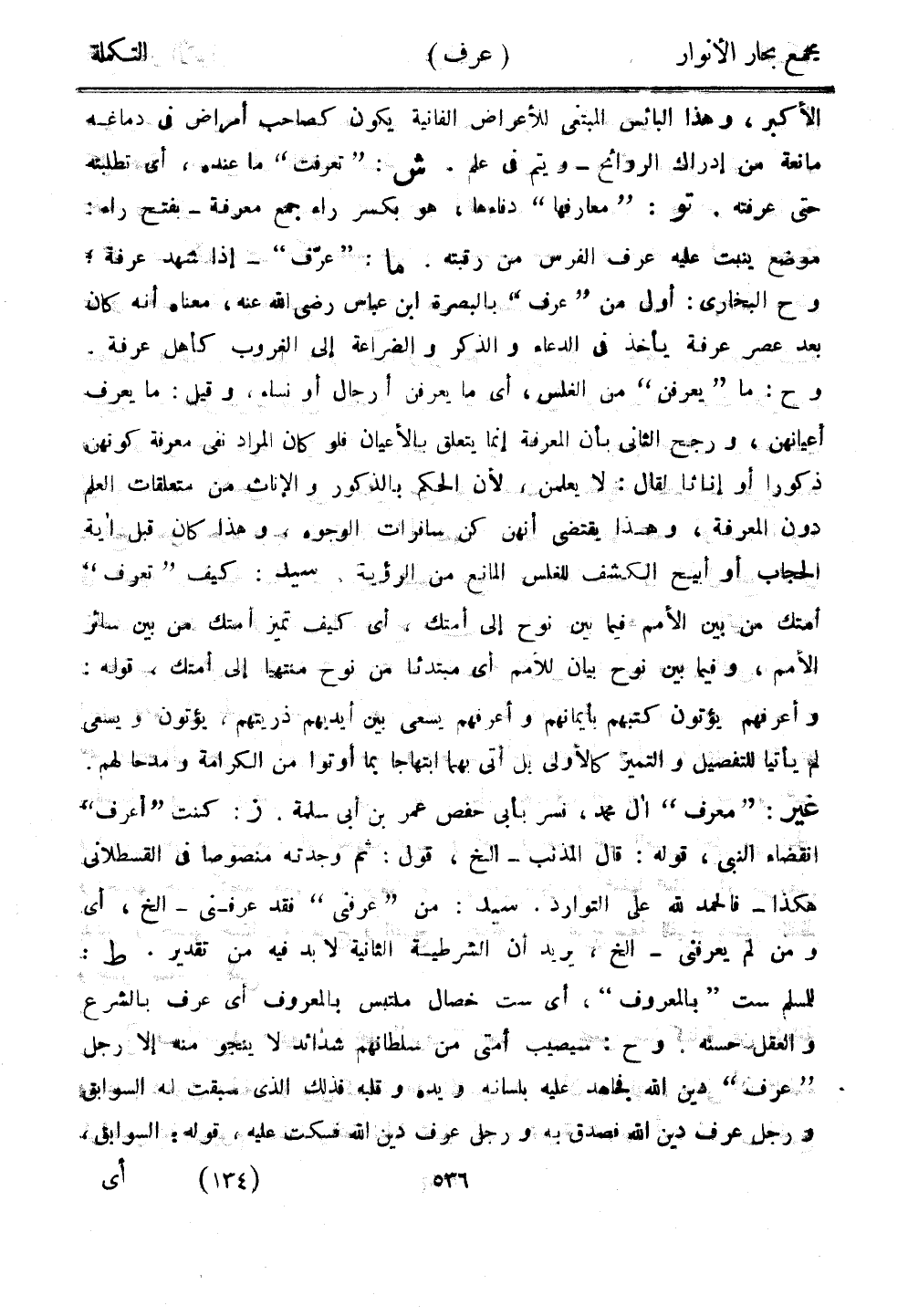 الأكبر، وهذا البائس المبتغي للأعراض الفانية يكون صاحب أمراض في دماغه مانعة من إدراك الروائح-ويتم في علم. ش: "تعرفت" ما عنده، أي تطلبه حتى عرفته. تو: "معارفها" دفاءها، هو بكسر راء جمع معرفة - بفتح راء: موضع ينبت عليه عرف الفرس من رقبته. ما: "عرف"-إذا شهد عرفة، وح البخاري: أول من "عرف" بالبصرة ابن عباس رضي الله عنه، معناه أنه كن بعد عصر عرفة يأخذ في الدعاء والذكر والضراعة إلى الغروب كأهل عرفه. وح: ما "يعرفن" من الغلس، أي ما يعرفن أرجال أو نساء. وقيل: ما يعرف أعيانهن، ورجح الثاني بأن المعرفة إنما يتعلق بالأعيان فلو كان المراد نفي معرفة كونهن ذكورًا أو إناثًا لقال: لا يعلمن، لأن الحكم بالذكور والإناث من متعلقات العلم دون المعرفة، وهذا يقتضي أنهن كن سافرات الوجوه. وهذا كان قبل أية الحجاب أو أبيح الكشف للغلس المانع من الرؤية. سيد: كيف "تعرف" أمتك من بين الأمم فيما بين نوح إلى أمتك، أي يف تميز أمتك من بين سائر الأمم، وفيما بين نوح بيان للأمم أي مبتدئًا من نوح منتهيًا إلى أمتك، قوله: وأعرفهم يؤتون تبهم بأيمانهم وأعرفهم يسعى بين أيديهم ذريتهم، يؤتون ويسعى لم يأتيا للتفصيل والتميز الأولى بل أتى بهما ابتهاجًا بما أوتوا من الكرامة ومدحًا لهم. غير: "معرف" أل محمد، نسر بأبي حفص عمر بن أبي سلمة. ز: كنت "أعرف" انقضاء النبي، قوله: قال المذنب-إلخ، قول: ثم وجدته منصوصًا في القسطلاني هكذا - فالحمد لله على التوارد. سيد: من "عرفني" فقد عرفني - إلخ، أي ومن لم يعرفني-إلخ، يريد أن الشرطية الثانية لابد فيه من تقدير. ط: للمسلم ست "بالمعروف"، أي ست خصال ملتبس بالمعروف أي عرف بالشرع والعقل حسنه. وح: سيصيب أمتي من سلطانهم شدائد لا ينجو منه إلا رجل "عرف" دين الله فجاهد عليه بلسانه ويده وقلبه فذلك الذي سبقت له السوابق ورجل عرف دين الله فصدق به ورجل عرف دين الله فسكت عليه، قوله: السوابق،