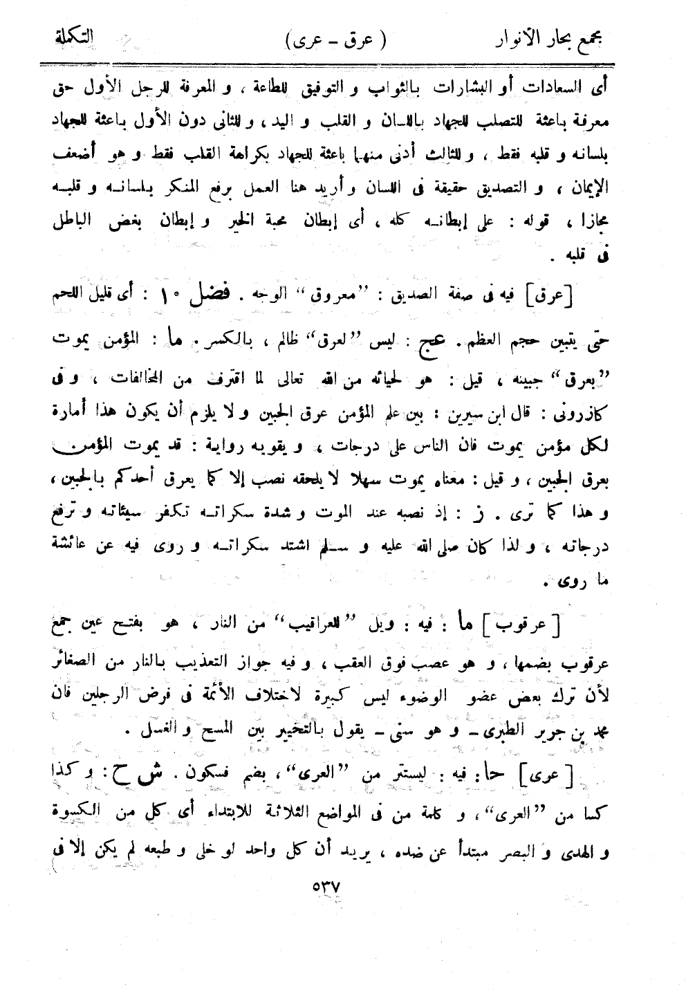 [عرق] فيه في صفة الصديق: "معروق" الوجه. فضل 10: أي قليل اللحم حتى يتبين حجم العظم. عج: ليس "لعرق" ظالم، بالكسر. ما: المؤمن يموت "بعرق" جبينه، قيل: هو لحيائه من الله تعالى لما اقترف من المخالفات، وفي كازروني: قال ابن سيرين: بين علم المؤمن عرق الجبين ولا يلزم أن يكون هذا أمارة لكل مؤمن يموت فإن الناس على درجات، ويقويه رواية: قد يموت المؤمن بعرق الجبين، وقيل: معناه يموت سهلًا لا يلحقه نصب إلا كما يعرق أحدكم بالجبين، وهذا كما ترى. ز: إذ نصبه عند الموت وشدة سكراته تكفر سيئاته وترفع درجاته، ولذا كان صلى الله عليه وسلم اشتد سكراته وروى فيه عن عائشة ما روى.