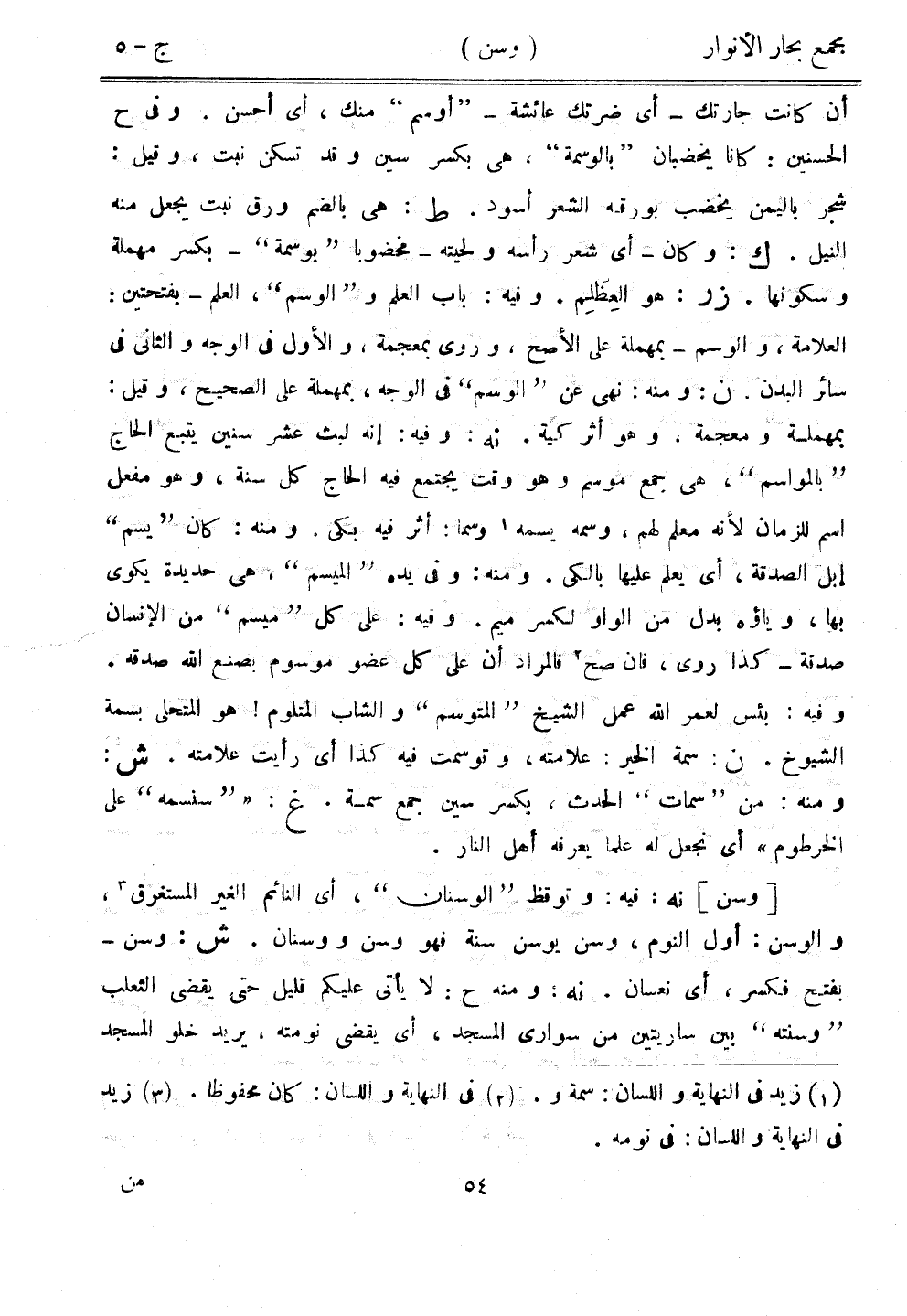 أن كانت جارتك- أي ضرتك عائشة - "أوسم" منك، أي أحسن. وفي ح الحسنين: كانا يخضبان "بالوسمة"، هي بكسر سين وقد تسكن نبت، وقيل: شجر باليمن يخضب بورقه الشعر أسود. ط: هي بالضم ورق نبت يجعل منه النيل. ك: وكان - أي شعر رأسه ولحيته - مخضوبًا "بوسمة" - بكسر مهملة وسكونها. زر: هو العِظلمِ. وفيه: باب العلم و"الوسم"، العلم - بفتحتين: العلامة، والوسم - بمهملة على الأصح، وروى بمعجمة، والأول في الوجه والثاني في سائر البدن. ن: ومنه: نهى عن "الوسم" في الوجه، بمهملة على الصحيح، وقيل: بمهملة ومعجمة، وهو أثر كية. نه: وفيه: إنه لبث عشر سنين يتبع الحاج "بالمواسم"، هي جمع موسم وهو وقت يجتمع فيه الحاج كل سنة، وهو مفعل اسم للزمان لأنه معلم لهم، وسمه يسمه وسما: أثر فيه بكى. ومنه: كان "يسم" إبل الصدقة، أي يعلم عليها بالكي. ومنه: وفي يده "الميسم"، هي حديدة يكوى بها، وياؤه بدل من الواو لكسر ميم. وفيه: على كل "ميسم" من الإنسان صدقة - كذا روى، فإن صح فالمراد أن على كل عضو موسوم بصنع الله صدقه. وفيه: بئس لعمر الله عمل الشيخ "المتوسم" والشاب المتلوم! هو المتحلي بسمة الشيوخ. ن: سمة الخير: علامته، وتوسمت فيه كذا أي رأيت علامته. ش: ومنه: من "سمات" الحدث، بكسر سين جمع سمة. غ: "سنسمه" على الخرطوم" أي نجعل له علمًا يعرفه أهل النار.