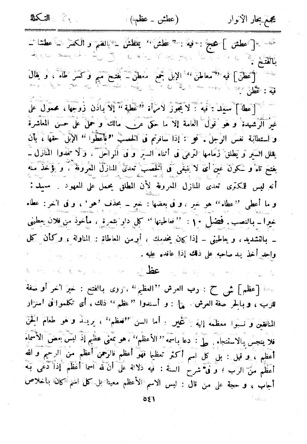 [عظم] ش ح: رب العرش "العظيم"، روى بالفتح: خبر آخر أو صفة للرب، وبالجر صفة العر. ما: وأسندوا "عظم" ذلك، أي تكلموا في أسرار المنافقين ونسبوا معظمه إليه. غير: أما السن "فعظم"، يريد وهو طعام الجن فلا ينجس بالاستنجاء. ط: دعا باسمه"الأعظم"، هو بمعنى عظيم إذ ليس بعض الأسماء أعظم، وقيل: بل كل اسم أكثر تعظيمًا فهو أعظم فالرحمن أعظم من الرحيم والله أعظم من الرب، وفي شرح السنة: فيه دلالة على أن لله اسما أعظم إذا دعى به أجاب، وحجة على من قال: ليس الاسم الأعظم معينًا بل كل اسم كان بإخلاص