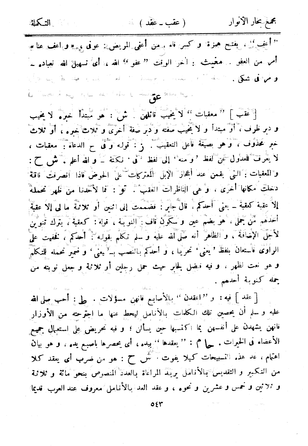[عقد] فيه: و"اعقدن" بالأصابع فإنهن مسؤلات. ط: أحب صلى الله عليه وسلم أن يحصين تلك الكلمات بالأنامل ليحط عنها ما اجترحته من الأوزار فإنهن يشهدن على أنفسهن بما اكتسبها حين يسألن؛ وفيه تحريض على استعمال جميع الأعضاء في الخيرات. حا م: "يعقدها" بيده، أي يحصرها بإصبع يده، وهو بيان اهتمام، عد هذه التسبيحات كيلا يفوت. ش ح: هو من ضرب أي يعقد كلا من التكبير والتقديس بالأنامل يريد المراعاة بالعدد المنصوص بنحو مائة وثلاثة وثلاثين وخمس وعشرين ونحوهن وعقد العد بالأنامل معروف عند العرب قديمًا