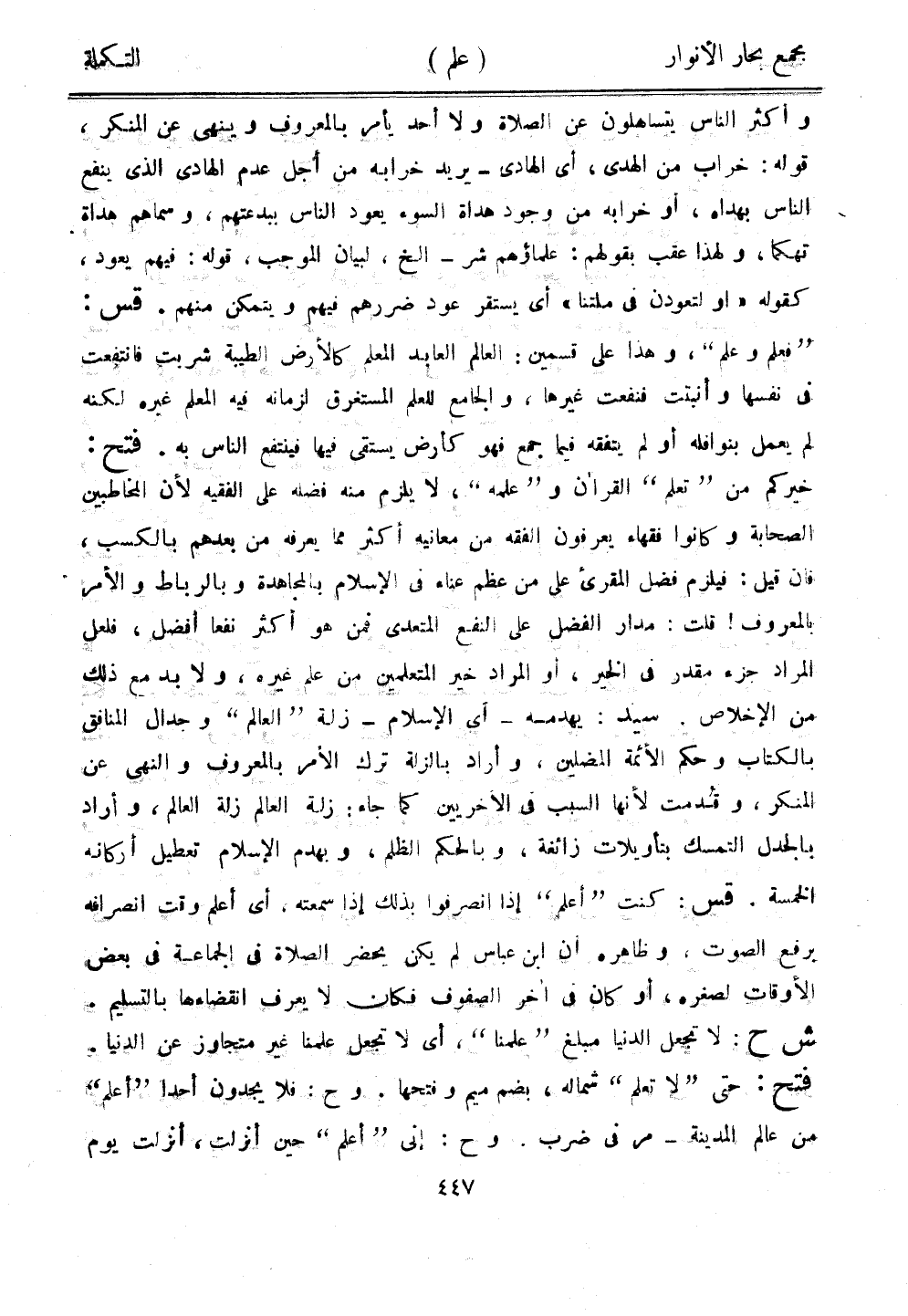وأكثر الناس يتساهلون عن الصلاة ولا أحد يأمر بالمعروف وينهى عن المنكر، قوله: خراب من الهدي، أي الهادي - يريد خرابه من أجل عدم الهادي الذي ينفع الناس بهداه، أو خرابه من وجود هداة السوء يعود الناس ببدعتهم، وسماهم هداة تهكما، ولهذا عقب بقولهم: علماؤهم شر - إلخ، لبيان الموجب، قوله: فيهم يعود، كقوله "أو لتعودن في ملتنا" أي يستقر عود ضررهم فيهم ويتمكن منهم. قس: "فعلم وعلم"، وهذا على قسمين: العالم العابد المعلم كالأرض الطيبة شربت فانتفعت في نفسها وأنبتت فنفعت غيرها، والجامع للعلم المستغرق لزمانه فيه المعلم غيره لكنه لم يعمل بنوافله أو لم يتفقه فيما جمع فهو كأرض يستقي فيها فينتفع الناس به. فتح: خيركم من "تعلم" القرآن و"علمه"، لا يلزم منه فضله على الفقيه لأن المخاطبين الصحابة وكانوا فقهاء يعرفون الفقه من معانيه أكثر مما يعرفه من بعدهم بالكسب، فإن قيل: فيلزم فضل المقرئ على من عظم عناء في الإسلام بالمجاهدة وبالرباط والأمر بالمعروف! قلت: مدار الفضل على النفع المتعدي فمن هو أكثر نفعًا أفضل، فلعل المراد جزء مقدر في الخير، أو المراد خير المتعلمين من علم غيره، ولا بد مع ذلك من الإخلاص. سيد: يهدمه- أي الإسلام- زلة "العالم" وجدال المنافق بالكتاب وحكم الأئمة المضلين، وأراد بالزلة ترك الأمر بالمعروف والنهي عن المنكر، وقُدمت لأنها السبب في الآخريين كما جاء: زلة العالم زلة العالم، وأراد الخمسة. قس: كنت "أعلم" إذا انصرفوا بذلك إذا سمعته، أي أعلم وقت انصرافه برفع الصوت، وظاهره أن ابن عباس لم يكن يحضر الصلاة في الجماعة في بعض الأوقات لصغره، أو كان في آخر الصفوف فكان لا يعرف انقضاءها بالتسليم. ش ح: لا تجعل الدنيا مبلغ "علمنا"، أي لا تجعل علمنا غير متجاوز عن الدنيا. فتح: حتى "لا تعلم" شماله، بضم ميم وفتحها. وح: فلا يجدون أحدًا "أعلم" من عالم المدينة - مر في ضرب. وح: ني "أعلم" حين أنزلت، أنزلت يوم