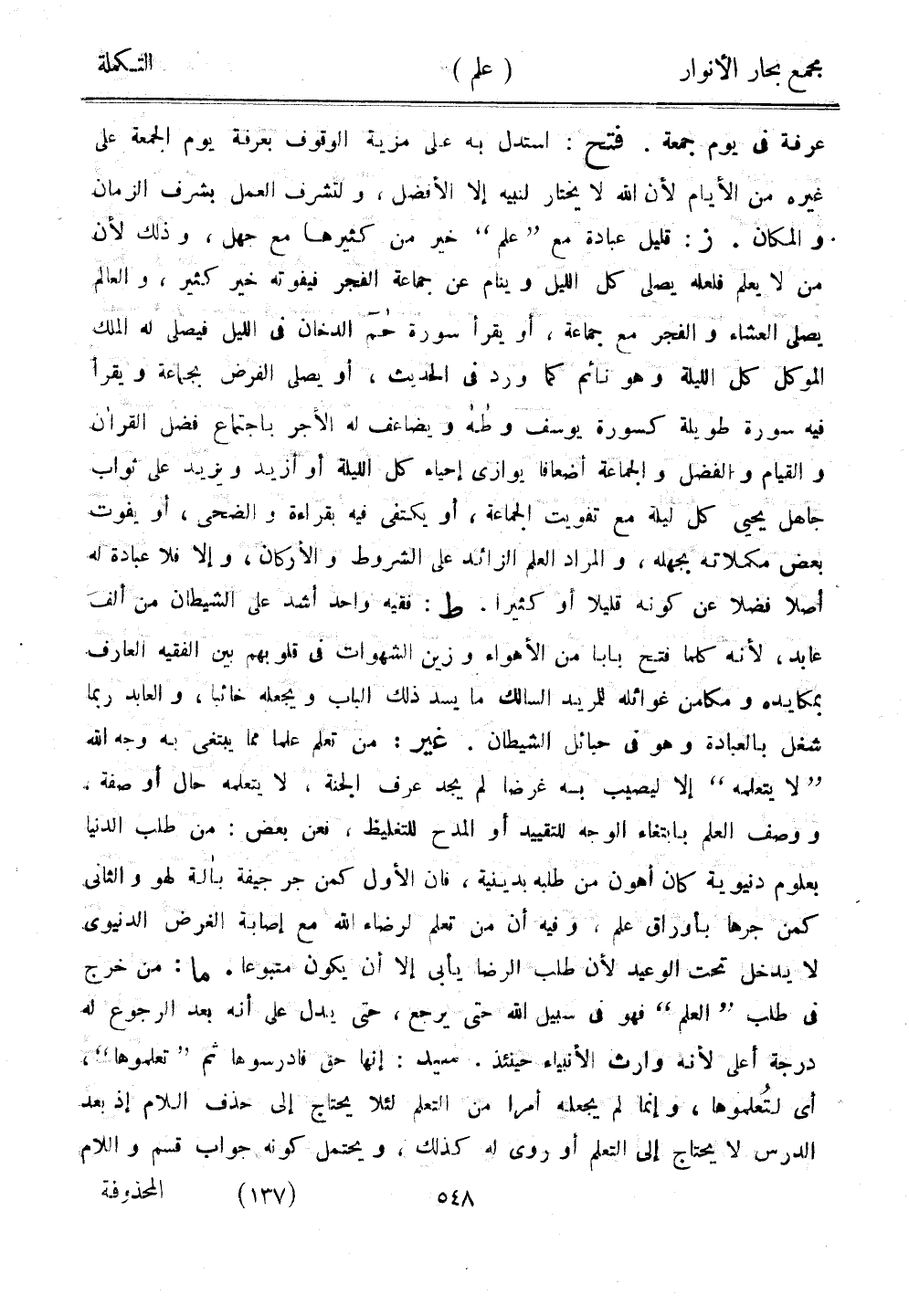 عرفة في يوم جمعة. فتح: استدل به على مزية الوقوف بعرفة يوم الجمعة على غيره من الأيام لأن الله لا يختار لنبيه إلا الأفضل، ولتشرف العمل بشرف الزمان والمكان. ز: قليل عبادة مع "علم" خير من كثيرها مع جهل، وذلك لأن من لا يعلم فلعله يصلي كل الليل وينام عن جماعة الفجر فيفوته خير كثير، والعالم يصلي العشاء والفجر مع جماعة، أو يقرأ سورة حم الدخان في الليل فيصلي له الملك الموكل كل الليلة وهو نائم كما ورد في الحديث، أو يصلي الفرض بجماعة ويقرأ فيه سورة طويلة كسورة يوسف وطه ويضاعف له الأجر باجتماع فضل القرآن والقيام والفضل والجماعة أضعافًا يوازي إحياء كل الليلة أو أزيد ويزيد على ثواب جاهل يحيى كل ليلة مع تفويت الجماعة، أو يكتفي فيه بقراءة والضحى، أو يفوت بعض مكملاته بجهله، والمراد العلم الزائد على الشروط والأركان، وألا فلا عبادة له أصلًا فضلًا عن كونه قليلًا أو كثيرًا. ط: فقيه واحد أشد على الشيطان من ألف عابد، لأنه كلما فتح بابًا من الأهواء وزين الشهوات في قلوبهم بين الفقيه العارف بمكايده ومكامن غوائله للمريد السالك ما يسد ذلك الباب ويجعله خائبًا، والعابد ربما شغل بالعبادة وهو في حبائل الشيطان. غير: من تعلم علمًا مما يبتغي به وجه الله "لا يتعلمه" إلا ليصيب به غرضًا لم يجد عرف الجنة، لا يتعلمه حال أوصفة. ووصف العلم بابتغاء الوجه للتقييد أو المدح للتغليظ، فعن بعض: من طلب الدنيا بعلوم دنيوية كان أهون من طلبه بدينية، فإن الأول كمن جر جيفة بآلة لهو والثاني كمن جرها بأوراق علم، وفيه أن من تعلم لرضاه الله مع إصابة الغرض الدنيوي لا يدخل تحت الوعيد لأن طلب الرضا يأبى إلا أن يكون متبوعًا. ما: من خرج في طلب "العلم" فهو في سبيل الله حتى يرجع، حتى يدل على أنه بعد الرجوع له درجة أعلى لأنه وارث الأنبياء حينئذ. سيد: إنها حق فادرسوها ثم "تعلموها"، أي لتعلموها، وإنما لم يجعله أمرًا من التعلم لئلا يحتاج إلى حذف اللام إذ بعد الدرس لا يحتاج إلى التعلم أو روى له كذلك، ويحتمل كونه جواب قسم واللام