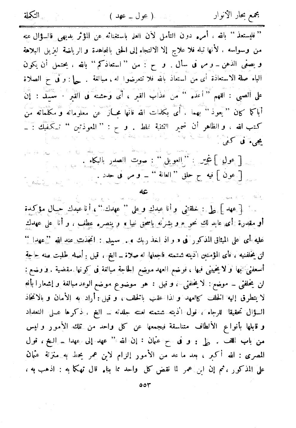 "فليستعذ" بالله، أمره دون التأمل لأن العلم باستغنائه عن المؤثر بديهي فالسؤال عنه من وسواسه، لأنها تبله فلا علاج إلا الالتجاء إلى الحق بالمجاهدة والرياضة ليزيل البلاهة ويصفي الذهن - ومر في سأل. وح: من "استعاذكم" بالله، يحتمل أن يكون الباء صلة الاستعاذة أي من استعاذ بالله فلا تتعرضوا له، مبالغة. حا: وفي ح الصلاة على الصبي: اللهم "أعده" من عذاب القبر، أي وحشته في القبر. سيد: إن أباكما كان "يعوذ" بهما، أي بكلمات الله فإنها مجاز عن معلوماته وملماته من كتب الله، والظاهر أن ضمير التثنية غلط. وح: "المعوذتين" تكفيك:- يجيء في كفى.