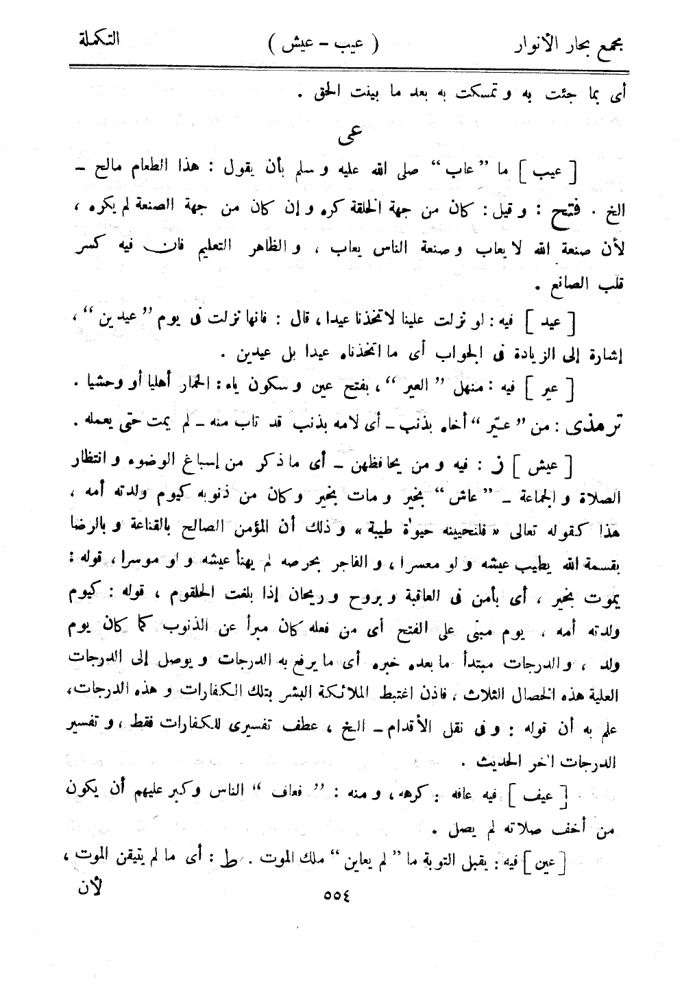 [عيش] ز: فيه ومن يحافظهن - أي ما ذكر من إسباغ الوضوء وانتظار الصلاة والجماعة-"عاش" بخير ومات بخير وكان من ذنوبه كيوم ولدته أمه، هذا كقوله تعالى "فلنحيينه حياة طيبة" وذلك أن المؤمن الصالح بالقناعة وبالرضا بقسمة الله يطيب عيشه ولو معسرا، والفاجر بحرصه لم يهنأ عيشه واو موسرًا، قوله: يموت بخير، أي بأمن في العاقبة وبروح وريحان إذا بلغت الحلقوم، قوله: كيوم ولدته أمه، يوم مبني على الفتح أي من فعله كان مبرأ عن الذنوب كما كان يوم ولد، والدرجات مبتدأ ما بعده خبره أي ما يرفع به الدرجات ويوصل إلى الدرجات العلية هذه الخصال الثلاث، فإذن اغتبط الملائكة البشر بتلك الكفارات وهذه الدرجات، علم به أن قوله: وفي نقل الأقدام-إلخ، عطف تفسير للكفارات فقط، وتفسير الدرجات أخر الحديث.