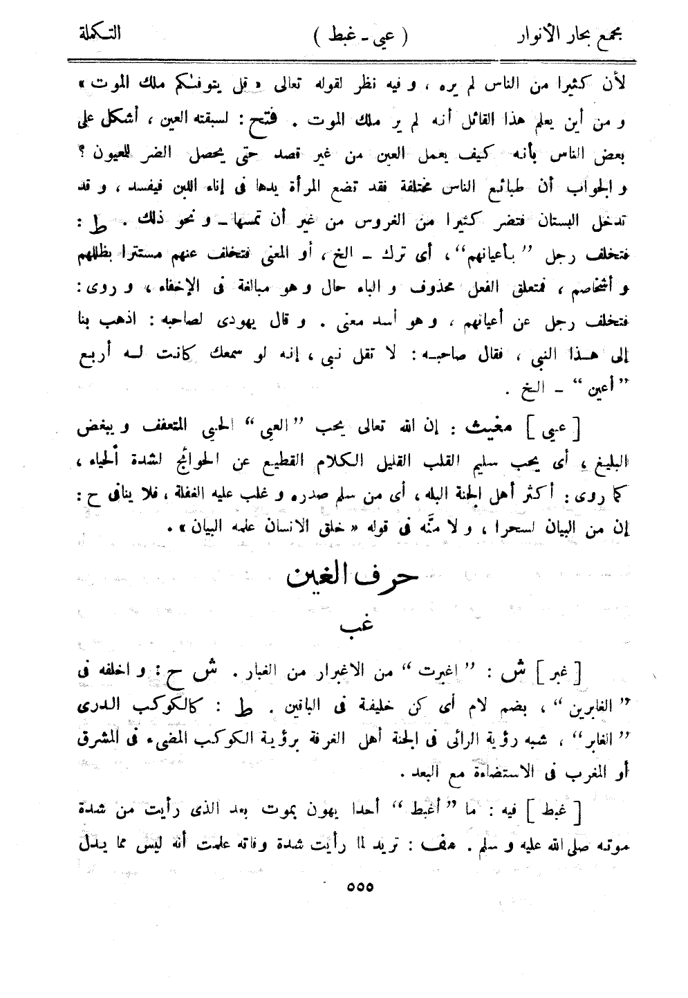 [غبر] ش: "اغبرت" من الاغبرار من الغبار. ش ح: واخلفه في "الغابرين"، بضم لام أي كن خليفة في الباقين. ط: كالكوكب الدري "الغابر"، شبه رؤية الرائي في الجنة أهل الغرفة برؤية الكوكب المضيء في المشرق أو المغرب في الاستضاءة مع البعد.