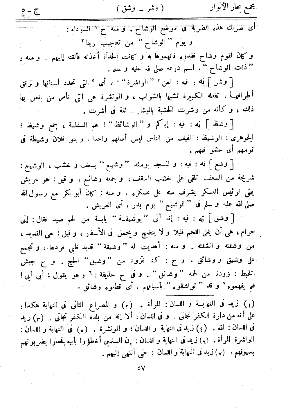 [وشق] نه: فيه: إنه أتى "بوشيقة" يابسة من لحم صيد فقال: إني حرام، هي أن يغلي اللحم قليلًا ولا ينضج ويحمل في الأسفار، وقيل: هي القديد، من وشقته واتشقته. ومنه: أهديت له "وشيقة" قديد ظبي فردها، وتجمع على وشيق ووشائق. وح: كنا نتزود من "وشيق" الحج. وح جيش الخبط: تزودونا من لحمه "وشائق". وفي ح حذيفة: وهو يقول أبي أبي! فلم يفهموه وقد "تواشقوه" بأسيافهم، أي قطعوه وشائق.
