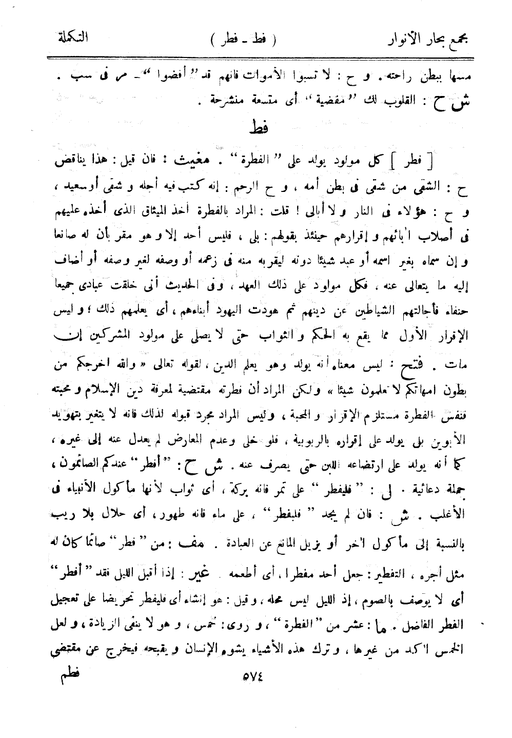 [فطر] كل مولود يولد على "الفطرة". مغيث: فإن قيل: هذا يناقض ح: الشقي من شقى في بطن أمه، وح الرحم: إنه كتب فيه أجله وشقي أو سعيد، وح: هؤلاء في النار ولا أبالي! قلت: المراد بالفطرة أخذ الميثاق الذي أخذه عليهم في أصلاب أبائهم وإقرارهم حينئذ بقولهم: بلى، فليس أحد إلا وهو مقر بأن له صانعًا وإن سماه بغير اسمه أو عبد شيئًا دونه ليقربه منه في زعمه أو وصفه لغير وصفه أو أضاف إليه ما يتعالى عنه، فكل مولود على ذلك العهد، وفي الحديث أنى خلقت عبادي جميعًا حنفاء فأجالتهم الشياطين عن دينهم ثم هودت اليهود أبناءهم، أي يعلمهم ذلك، وليس الإقرار الأول مما يقع به الحكم والثواب حتى لا يصلي على مولود المشركين إن مات. فتح: ليس معناه أنه يولد وهو يعلم الدين، لقوله تعالى "والله أخرجكم من بطون أمهاتكم لا تعلمون شيئًا" ولكن المراد أن فطرته مقتضية لمعرفة دين الإسلام ومحبته فنفس الفطرة مستلزم الإقرار والمحبة، وليس المراد مجرد قبوله لذلك فنه لا يتغير بتهويد الأبوين بل يولد على إقراره بالربوبية، فلو خلى وعدم المعارض لم يعدل عنه إلى غيره، كما أنه يولد على ارتضاعه اللبن حتى يصرف عنه. ش ح: "أفطر" عندكم الصائمون، جملة دعائية. ل: "فليفطر" على تمر فإنه بركة، أي ثواب لأنها مأكول الأنبياء في الأغلب. ش: فإن لم يجد "فليفطر"، على ماء فإنه طهور، أي حلال بلا ريب بالنسبة إلى مأكول آخر أو يزيل المانع عن العبادة. مف: من "فطر" صائمًا كان له مثل أجره، التفطير: جعل أحد مفطرًا، أي أطعمه. غير: إذا أقبل الليل فقد "أفطر" أي لا يوصف بالصوم، إذ الليل ليس محله، وقيل: هو إنشاء أي فليفطر تحريضًا على تعجيل الفطر الفاضل. ما عشر من "الفطرة"، وروي: خمس، وهو لا ينفي الزيادة، ولعل الخمس أكد من غيرها، وترك هذه الأشياء يشوه الإنسان ويقبحه فيخرج عن مقتضى