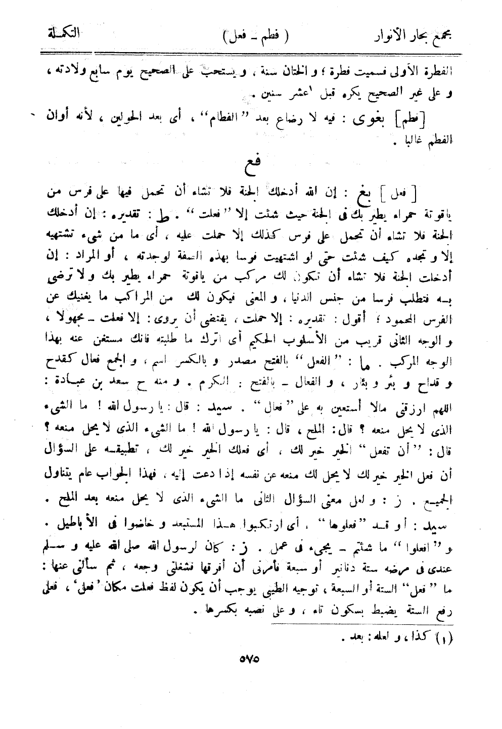 [فعل] بغ: إن الله أدخلك الجنة فلا تشاء أن تحمل فيها على فرس من ياقوتة حمراء يطير بك في الجنة حيث شئت إلا "فعلت". ط: تقديره: إن أدخلك الجنة فلا تشاء أن تحمل على فرس كذلك إلا حملت عليه، أي ما من شيء تشتهيه إلا وتجده كيف شئت حتى لو اشتهيت فرسًا بهذه الصفة لوجدته، أو المراد: إن أدخلت الجنة فلا تشاء أن تكون لك مركب من ياقوتة حمراء يطير بك ولاترضى به فتطلب فرسًا من جنس الدنيا، والمعنى فيكون لك من المراكب ما يغنيك عن الفرس المحمود؛ أقول: تقديره: إلا حملت، يقتضي أن يروي: إلا فعلت - مجهولًا، والوجه الثاني قريب من الأسلوب الحكيم أي اترك ما طلبته فنك مستغن عنه بهذا الوجه المركب. ما: "الفعل" بالفتح مصدر وبالكسر اسم، والجمع فعال كقدح وقداح وبئر وبئار، والفعال- بالفتح: الكرم. ومنه ح سعد بن عبادة: اللهم ارزقني مالا أستعين به على "فعال". سيد: قال: يا رسول الله! ما الشيء الذي لا يحل منعه قال: الملح، قال: يا رسول الله! ما الشيء الذي لا يحل منعه؟ قال: "أن تفعل" الخير خير لك، أي فعلك الخير خير لك، تطبيقه على السؤال أن فعل الخير خير لك لا يحل لك منعه عن نفسه إذا دعت إيه، فهذا الجواب عام يتناول الجميع. ز: ولعل معنى السؤال الثاني ما الشيء الذي لا يحل منعه بعد الملح. سيد أو قد "فعلوها"، أي ارتكبوا هذا المستبعد وخاضوا في الأباطيل. و"افعلوا" ما شئتم - يجيء في عمل. ز: كان لرسول الله صلى الله عليه وسلم عندي في مرضه ستة دنانير أو سبعة فامرني أن أفرقها فشغلني وجعه، ثم سألني عنها: ما "فعل" الستة أو السبعة، توجيه الطيبي يوجب أن يكون لفظ فعلت مكان "فعل"، فعلى رفع الستة يضبط بسكون تاء، وعلى نصبه بكسرها.