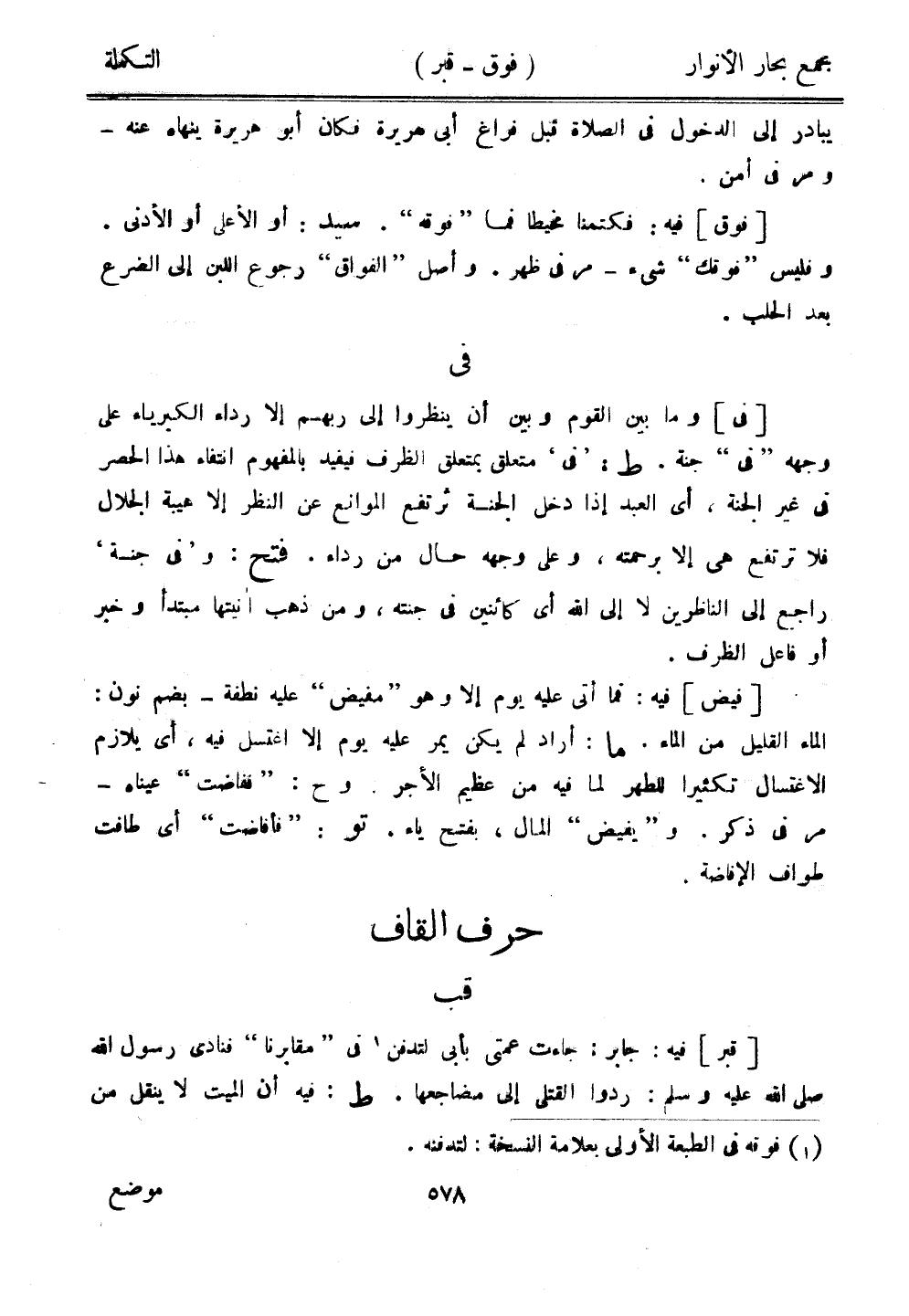 [فيض] فيه: فما أتى عليه يوم إلا وهو "مفيض" عليه نطفة- بضم نون: الماء القليل م الماء. ما: أراد لم يكن يمر عليه يوم إلا اغتسل فيه، أي يلازم الاغتسال تكثيرًا للطهر لما فيه من عظيم الأجر. وح: "ففاضت" عيناه - مر في ذكر. و"يفيض" المال، بفتح ياء، تو: "فأفاضت" أي طافت طواف الإفاضة.