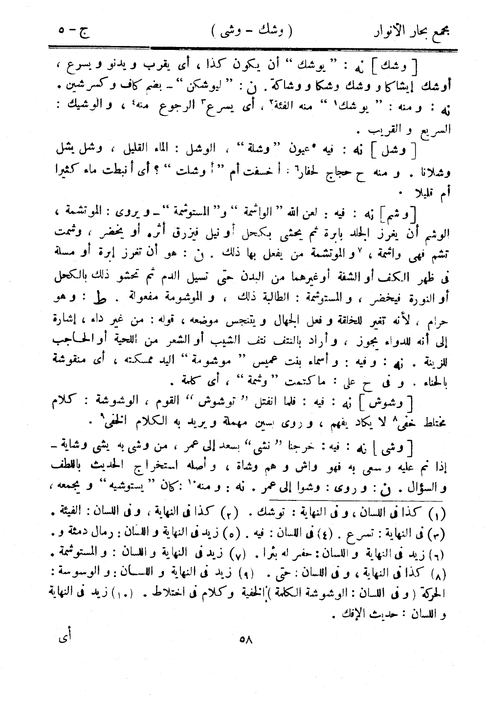 [وشك] نه: "يوشك" أن يكون كذا، أي يقرب ويدنو ويسرع، أوشك إيشاكًا وشك وشكا ووشاكة. ن:"ليوشكن" - بضم كاف وكسر شين. نه: ومنه: "يوشك" منه الفئة، أي يسرع الرجوع منه، والوشيك: السريع والقريب.