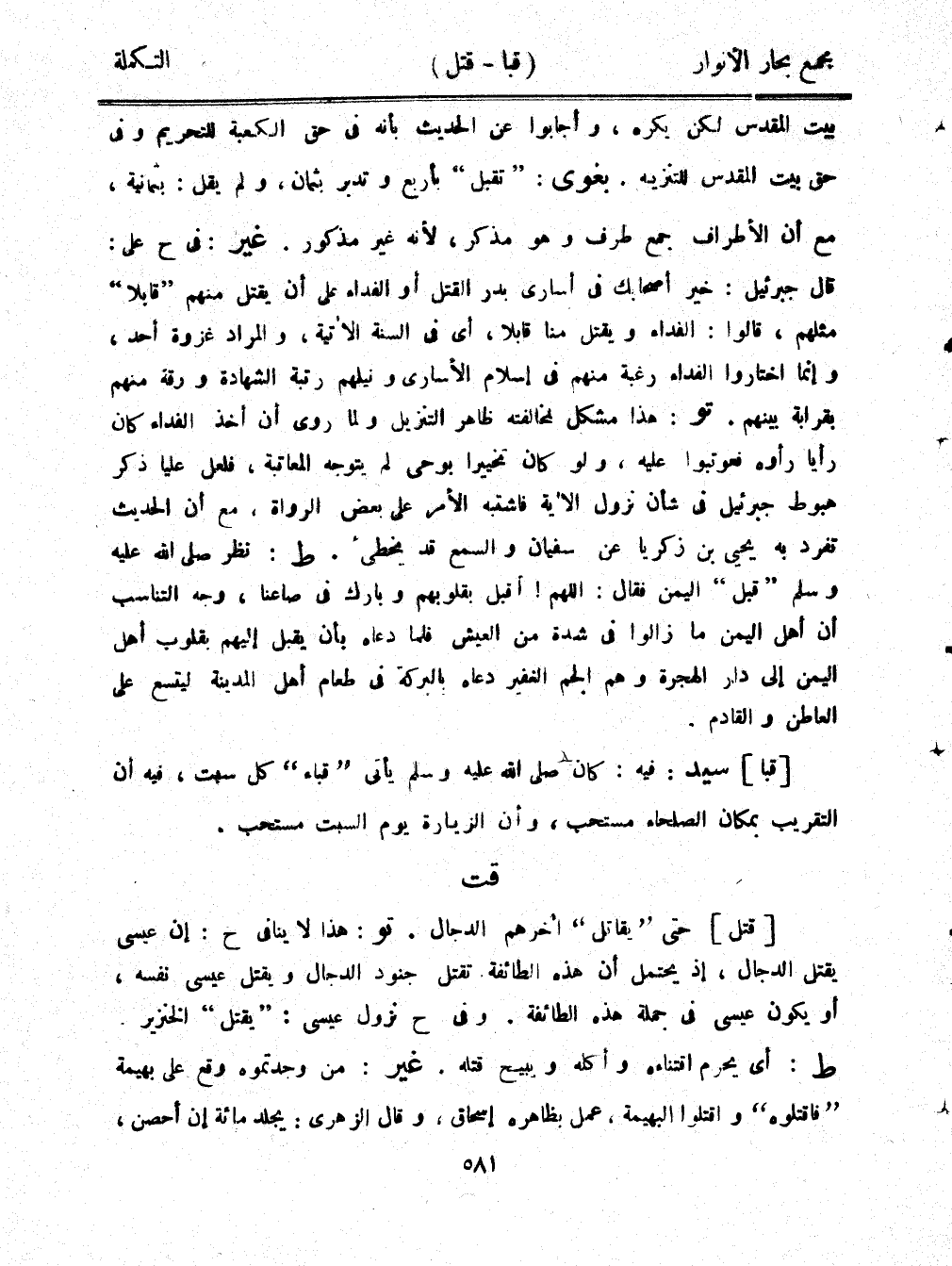 بيت المقدس لكن يكره، وأجابوا عن الحديث بأنه في حق الكعبة للتحريم وفي حق بيت المقدس للتنزيه. بغوى: "تقبل" بأربع وتدبر بثمان، ولم يقل: بثمانية، مع أن الأطراف جمع طرف وهو مذكر، لأنه غير مذكور. غير: في ح على: قال جبرئيل: خير أصحابك في أسارى بدر القتل أو الفداء على أن يقتل منهم "قابلًا" مثلهم، قالوا: الفداء ويقتل منا قابلًا، أي في السنة الآتية، والمراد غزوة أحد، وإنما اختاروا الفداء رغبة منهم في إسلام الأسارى ونيلهم رتبة الشهادة ورقة منهم بقرابة بينهم. تو: هذا مشكل لمخالفته ظاهر التنزيل ولما روى أن أخذ الفداء كان رأيًا رأوه فعوتبوا عليه، ولو كان تخييرًا بوحي لم يتوجه المعاتبة، فلعل عليا ذكر هبوط جبرئيل في شأن نزول الآية فاشتبه الأمر على بعض الرواة، مع أن الحديث تفرد به يحيى بن زكريا عن سفيان والسمع قد يخطئ. ط: نظر صلى الله عليه وسلم "قبل" اليمن فقال: اللهم! أقبل بقلوبهم وبارك في صاعنا، وجه التناسب أن أهل اليمن ما زالوا في شدة نم العيش فلما دعاه بأن يقبل إليهم بقلوب أهل اليمن إلى دار الهجرة وهم الجم النفير دعاه بالبركة في طعام أهل المدينة ليتسع على العاطن والقادم.