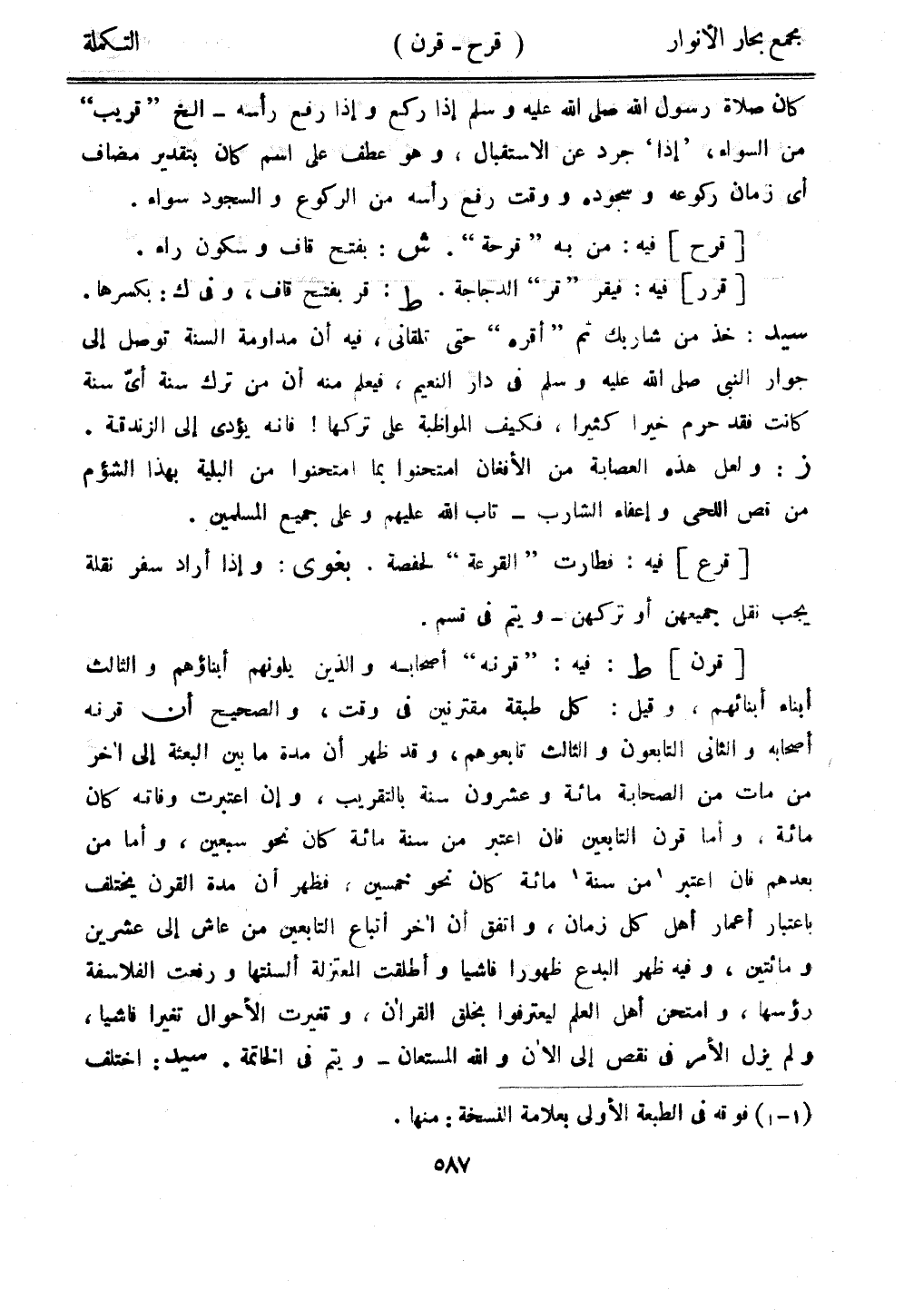 [قرن] ط: فيه: "قرنه" أصحابه والذين يلونهم أبناؤهم والثالث أبناء أبنائهم، وقيل: كل طبقة مقترنين في وقت، والصحيح أن قرنه أصحابه والثاني التابعون والثالث تابعوهم، وقد ظهر أن مدة ما بين البعثة إلى أخر من مات من الصحابة مائة وعشرون سنة بالتقريب، وإن اعتبرت وفاته كان مائة، وأما قرن التابعين فإن اعتبر من سنة مائة كان نحو سبعين، وأما من بعدهم فإن اعتبر من سنة مائة كان نحو خمسين، فظهر أن مدة القرن يختلف باعتبار أعمار أهل كل زمان، واتفق أن أخر أتباع التابعين من عاش إلى عشرين ومائتين، وفيه ظهر البدع ظهورًا فاشيًا وأطلقت المعتزلة ألسنتها ورفعت الفلاسفة رؤسها، وامتحن أهل العلم ليعترفوا بخلق القرآن، وتغيرت الأحوال تغيرًا فاشيًان ولم يزل الأمر في نقص إلى الآن والله المستعان- ويتم في الخاتمة. سيد: اختلف