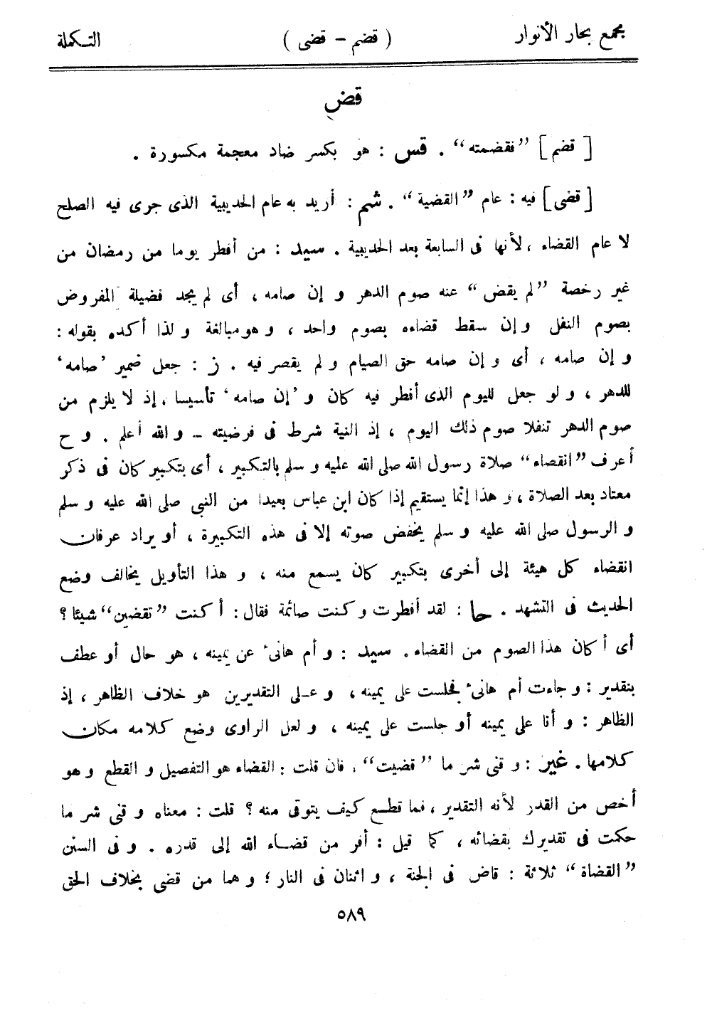 [قضى] فيه: عام "القضية". شم: أريد به عام الحديبية الذي جرى فيه الصلح لا عام القضاء، لأنها في السابعة بعد الحديبية. سيد: من أفطر يومًا من رمضان من غير رخصة "لم يقض" عنه صوم الدهر وإن صامه، أي لم يجد فضيلة المفروض بصوم النفل وإن سقط قضاءه بصوم واحد، وهو مبالغة ولذا أكده بقوله: وإن صامه، أي وإن صامه حق الصيام ولم يقصر فيه. ز: جعل ضمير "صامه" للدهر، ولو جعل لليوم الذي أفطر فيه كان و"إن صامه" تأسيسًا، إذ لا يلزم من صوم الدهر تنفلًا صوم ذلك اليوم، إذ النية شرط في فرضيته - والله أعلم. وح أعرف "انقصاء" صلاة رسول الله صلى الله عليه وسلم بالتكبير، أي بتكبير كان في ذكر معتاد بعد الصلاة، وهذا إثمًا يستقيم إذا كان ابن عباس بعيدًا من النبي صلى الله عليه وسلم والرسول صلى الله عليه وسلم يخفض صوته إلا في هذه التكبيرة، أو يراد عرفان انقضاء كل هيئة إلى أخرى بتكبير كان يسمع منه، وهذا التأويل يخالف وضع الحديث في التشهد. حا: لقد أفطرت وكنت صائمة فقال: أكنت "تقضين" شيئًا؟ أي أكان هذا الصوم من القضاء. سيد: وأم هانئ عن يمينه، هو حال أو عطف بتقدير: وجاءت أم هانئ فجلست على يمينه، وعلى التقديرين هو خلاف الظاهر، إذ الظاهر: وأنا على يمينه أو جست على يمينه، ولعل الراوي وضع كلامه مكان كلامها. غير: وقني شر ما "قضيت"، فإن قلت: القضاء هو التفصيل والقطع وهو أخص من القدر لأنه التقدير، فما قطع كيف يتوقى منه؟ قلت: معناه وقنى شر ما حكمت في تقديرك بقضائه، كما قيل: أفر من قضاء الله إلى قدره. وفي السنن "القضاة" ثلاثة: قاض في الجنة، واثنان في النار؛ وهما من قضى بخلاف الحق