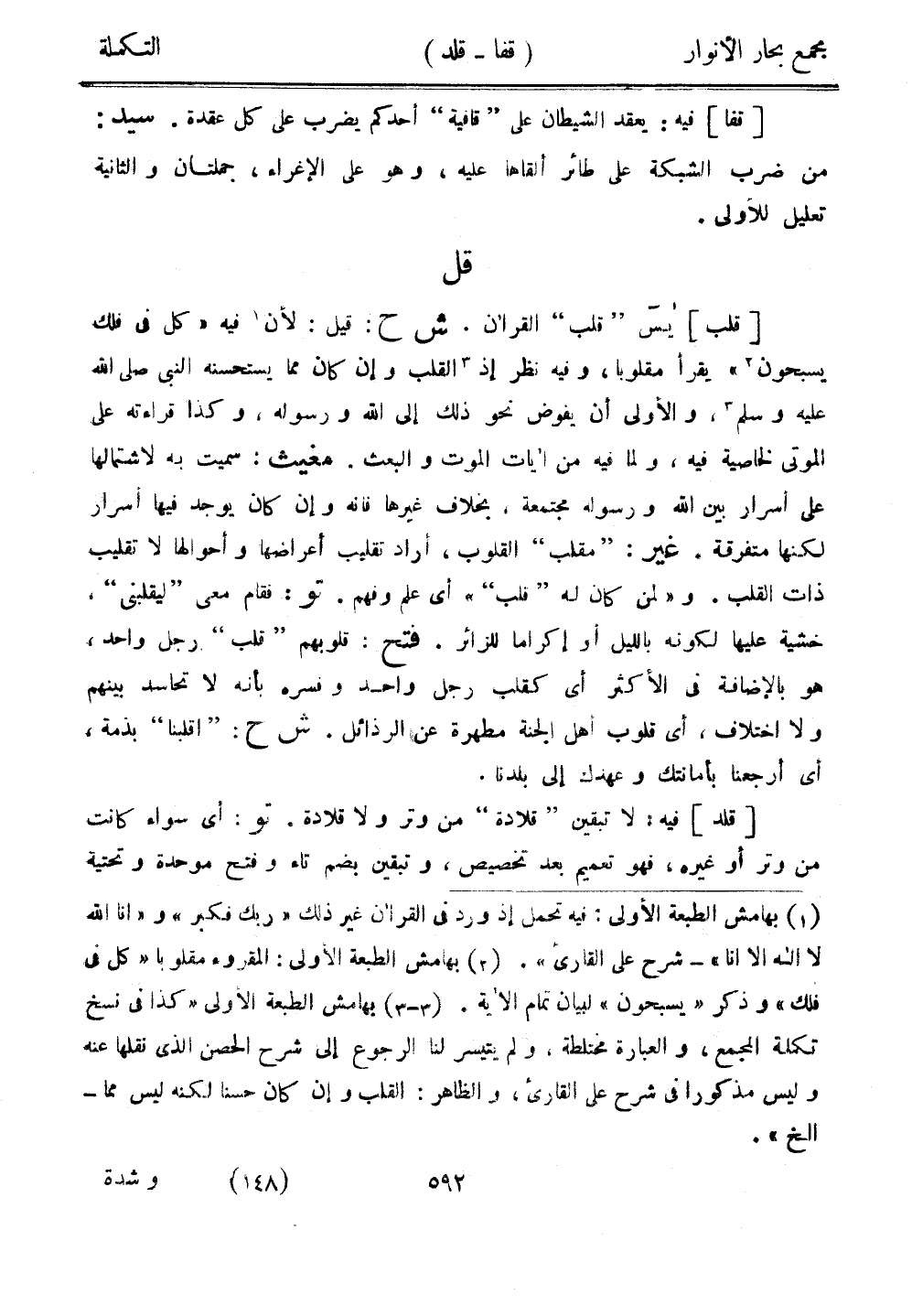 [قلب] يس "قلب" القرآن. ش ح: قيل: لأن فيه "كل في فلك يسبحون" يقرأ مقلوبًا، وفيه نظر إذ القلب وإن كان مما يستحسنه النبي صلى الله عليه وسلم، والأولى أن يفوض نحو ذلك إلى الله ورسوله، وكذا قراءته على الموتى لخاصية فيه، ولما فيه من آيات الموت والبعث. مغيث: سميت به لاشتمالها على أسرار بين الله ورسوله مجتمعة، بخلاف غيرها فإنه وإن كان يوجد فيها أسرار لكنها متفرقة. غير: "مقلب" القلوب، أراد تقليب أعراضها وأحوالها لا تقليب ذات القلب. و"لمن كان له "قلب"" أي علم وفهم. تو: فقام معي "ليقلبني"ن خشية عليها لكونه بالليل أو إكرامًا للزائر. فتح: قلوبهم "قلب" رجل واحد، هو بالإضافة في الأكثر أي كقلب رجل واحد وفسره بأنه لا تحاسد بينهم ولا اختلاف، أي قلوب أهل الجنة مطهرة عن الرذائل. ش ح: "اقلبنا" بذمة، أي أرجعنا بأمانتك وعهدك إلى بلدنا.