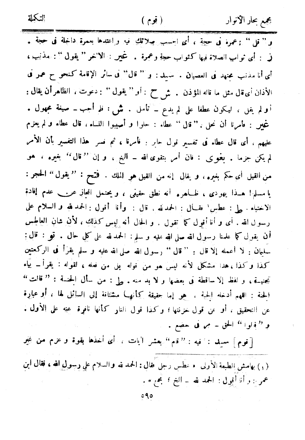 و"قل": عمره في حجة، أي احسب صلاتك فيه واعتدها بعمرة داخلة في حجة. ز: أي ثواب الصلاة فيها كثواب حجة وعمرة. غير: الآخر "يقول": مذنب، أي أنا مذنب مجتهد في العصيان. سيد: و"قال" في سائر الإقامة كنحو ح عمر في الأذان أي قال مثل ما قاله المؤذن. ش ح: أو "يقول": دعوت، الظاهر أن يقال: أو لم يقل، ليكون عطفًا على لم يدع - تأمل. ش: فلم أحب - صيغة مجهول. غير: فأمرنا أن نحل، "قال" عطاء: حلوا وأصيبوا النساء، قال عطاء ولم يعزم عليهم، أي قال عطاء في تفسير قول جابر: فأمرنا، ثم فسر هذا التفسير بأن الأمر لم يكن جزما. بغوي: فإن أمر بتقوى الله -إلخ، وإن "قال" بغيره، هو من القيل أي حكم بغيره، ويقال إنه من القيل هو الملك. فتح: "يقول" الحجر: يا مسلم! هذا يهودي، ظاهره أنه نطق حقيقي، ويحتمل المجاز عن عدم إفادة الاختباء. ط: عطس فقال: الحمد لله، قال: وأنا أقول: الحمد لله والسلام على رسول الله. أي وأنا أقول كما تقول. والحال أنه ليس كذلك، لأن شأن العاطس أن يقول كما علمنا رسول الله صلى الله عليه وسلم: الحمد لله على كل حال. تو: قال: سليمان: لا أعمله إلا قال: "قال" رسول الله صلى الله عليه وسلم يقرأ في الركعتين كذا وكذا، هذا مشكل لأنه ليسهو من قوله بل من فعله، لقوله: يقرأ - بياء تحتية، ولفظ إلا ساقطة في بعضها ولابد منه. ط: من سأل الجنة: "قالت" الجنة: اللهم أدخله الجنة، هو إما حقيقة كأنها مشافة إلى السائل لها، أو عبارة عن التحقيق، أو عن قول خزنتها، وكذا قول النار كأنها نافرة عنه على الأول. و"قالوا" الحق - مر في حضع.