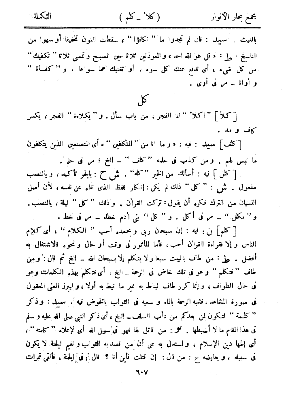 [كلم] ن: فيه: إن سبحان ربي وبحمد أحب "الكلام"، أي كلام الناس وإلا فقراءة القرآن أحب، فأما المأثور في وقت أو حال ونحوه فالاشتغال به أفضل. ط: من طاف بالبيت سبعًا ولا يتكلم إلا بسبحان الله - إلخ ثم قال: ومن طاف "فتكلم" وهو في تلك خاض في الرحمة-إلخ، أي فتكلم بهذه الكلمات وهو في حال الطواف، وإنما كرر طاف ليناط به غير ما نيط به أولا، وليبرز المعنى المعقول في صورة المشاهد، فشبه الرحمة بالماء وسعيه في الثواب بالخوض فيه. سيد: وذكر "كلمة" لتكون لمن بعدكم من دأب السلف - إلخ، أي ذكر النبي صلى الله عليه وسلم في هذا المقام ما لا أضبطها. تو: من قاتل لها فهو في سبيل الله أي لإعلاء "كلمته"، أي إظهار دين الإسلام، واستدل به على أن من قصد به الثواب ونعيم الجنة لا يكون في سبيله، ويعارضه ح: من قال: إن قتلت فأين أنا؟ قال: في الجنة، فألقى تمرات
