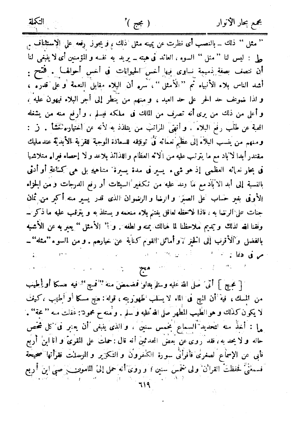 [مجج] أتى صلى الله عليه وسلم بدلو فمضمض منه "فمج" فيه مسكا أو أطيب من المسك، فيه أن المج في الماء لا يسلب طهوريته، قوله: مج مسكًا او أطيب، كيف لا يكون كذلك وهو الطيب المطهر صلى الله عليه وسلم. ومنه ح محمود: عقلت منه "مجة". ما: أخذ منه لتحديد السماع بخمس سنين، والذي ينبغي أن يعتبر في كل شخص حاله ولا يحد به، فقد روى عن بعض المحدثين أنه قال: حملت على المقرئ وأنا ابن أربع فأبى عن الإسماع لصغري فأقرأني سورة الكافرون والتكوير والمرسلات فقرأتها صحيحة فسمعني فحفظت القرىن ولى خمس سنين، وروى أنه حمل إلى المأمون صبي ابن أربع