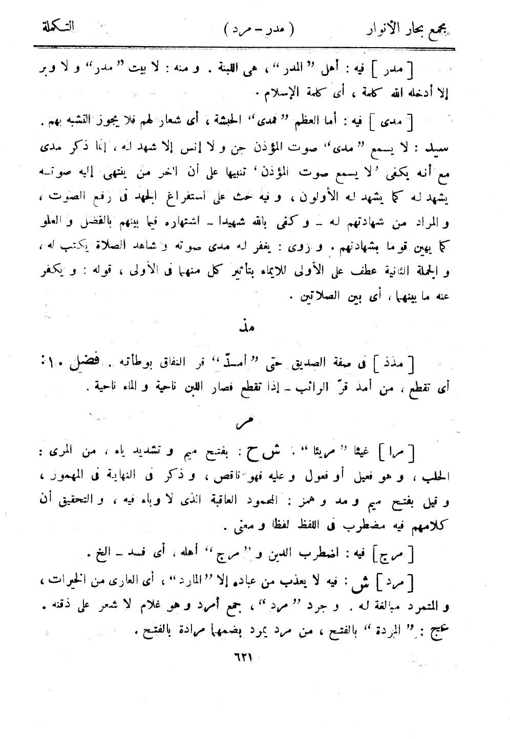 [مرد] ش: فيه لا يعذب من عباده إلا "المارد"، أي العاري من الخيرات، والمتمرد مبالغة له. وجرد "مرد"، جمع أمرد وهو غلام لا شعر على ذنقه، عج: "المردة" بالفتح، من مرد يمرد بضمهما مرادة بالفتح.