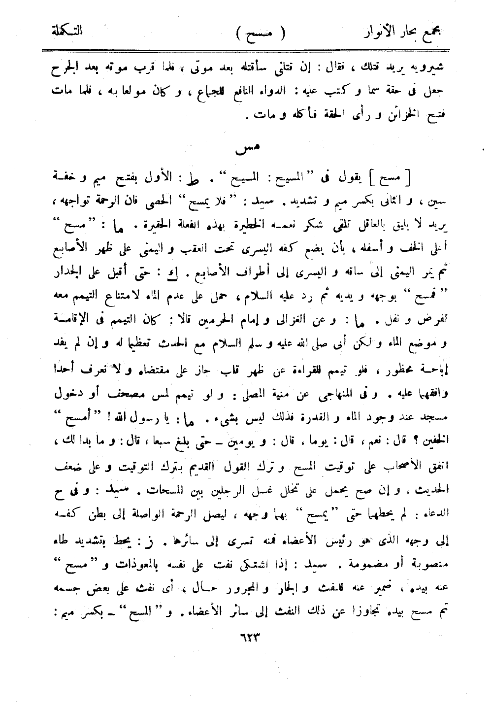 [مسح] يقول في "المسيح: المسيح". ط: الأول بفتح ميم وخفة سين، والثاني بكسر ميم وتشديد. سيد:"فلا يمسح" الحصى فإن الرحمة تواجهه، يريد لا يليق بالعاقل تلقى شكر نعمه الخطيرة بهذه الفعلة الحقيرة. ما: "مسح" أعلى الخف وأسفله، بأن يضع كفه اليسرى تحت العقب واليمنى على ظهر الأصابع ثم يمر اليمنى إلى ساقه واليسرى إلى أطراف الأصابع. ك: حتى أقبل على الجدار "فمسح" بوجهه ويديه ثم رد عليه السلام، حمل على عدم الماء لامتناع التيمم معه لفرض ونفل. ما: وعن الغزالي وإمام الحرمين قالا: كان التيمم في الإقامة وموضع الماء ولكن أبي صلى الله عليه وسلم السلام مع الحدث تعظيمًا له وإن لم يفد إباحة محظور، فلو تيمم للقراءة عن ظهر قلب جاز على مقتضاه ولا نعرف أحدًا وافقهما عليه. وفي المنهاجي عن منية المصلى: ولو تيمم لمس مصحف أو دخول مسجد عند وجود الماء والقدرة فذلك ليس بشيء. ما: يا رسول الله! "أمسح" الخفين؟ قال: نعم، قال: يوما، قال: ويومين -حتى بلغ سبعًا، قال: وما بدا لك، اتفق الأصحاب على توقيت المسح وترك القول القديم بترك التوقيت وعلى ضعف الحديث، وإن صح يحمل على تخلل غسل الرجلين بين المسحات. سيد: وفي ح الدعاء: لم يحطهما حتى "يمسح" بهما وجهه، ليصل الرحمة الواصلة إلى بطن كفه إلى وجهه الذي هو رئيس الأعضاء فمنه تسري إلى سائرها. ز: يحط بتشديد طاء منصوبة أو مضمومة. سيد: إذا اشتكى نفث على نفسه بالمعوذات و"مسح" عنه بيده، ضمير عنه للنفث والجار والمجرور حال، أي نفث على بعض جسمه ثم مسح بيده تجاوزًا عن ذلك النفث إلى سائر الأعضاء. و"المسح" - بكسر ميم: